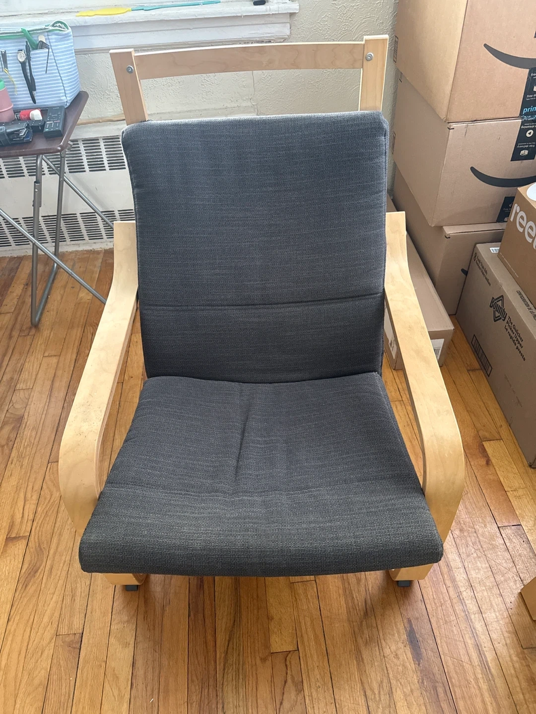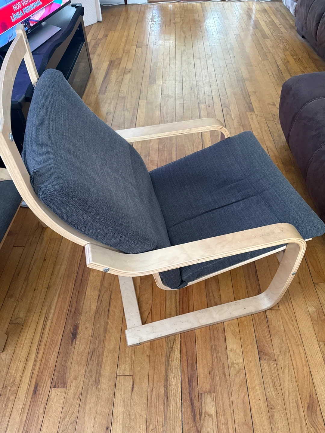 This is an Ikea Poang armchair with a dark gray fabric cushion and bentwood frame. It's a comfortable and stylish accent chair. The frame is made of laminated veneer lumber.