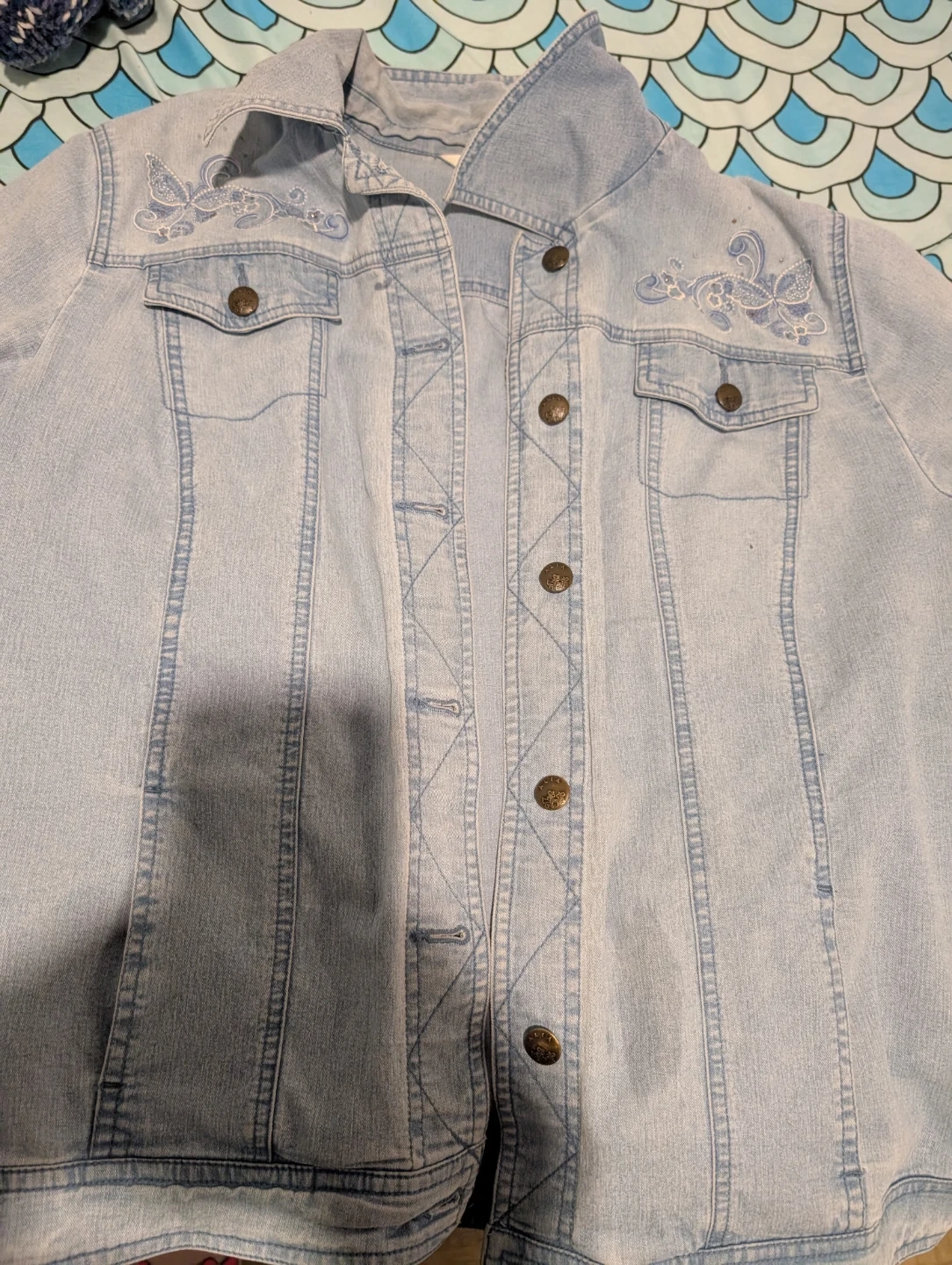 This light wash denim jacket features delicate butterfly embroidery on the chest pockets. It's made of soft denim and has a classic button-up front. The jacket's design makes it a stylish layering piece for any casual outfit. Size medium fits a bit bigger though. Asking only 5.00
