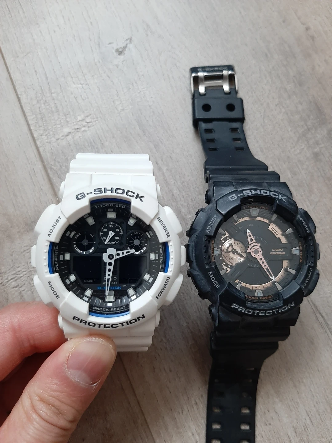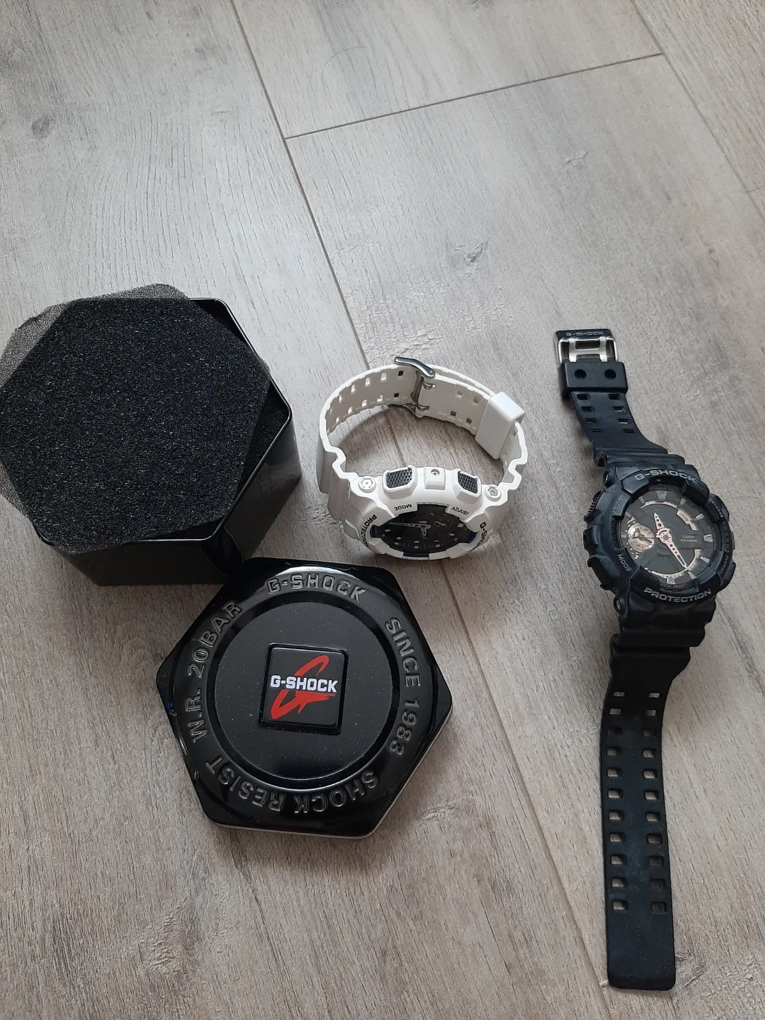 Two G-Shock watches, one black and one white. Both are shock-resistant and 20 bar water-resistant. Includes only 1 original hexagonal G-Shock tin box. Both are brand new condition and never used. Black has some dust. Received as a gift many years ago. Both needs new battery.