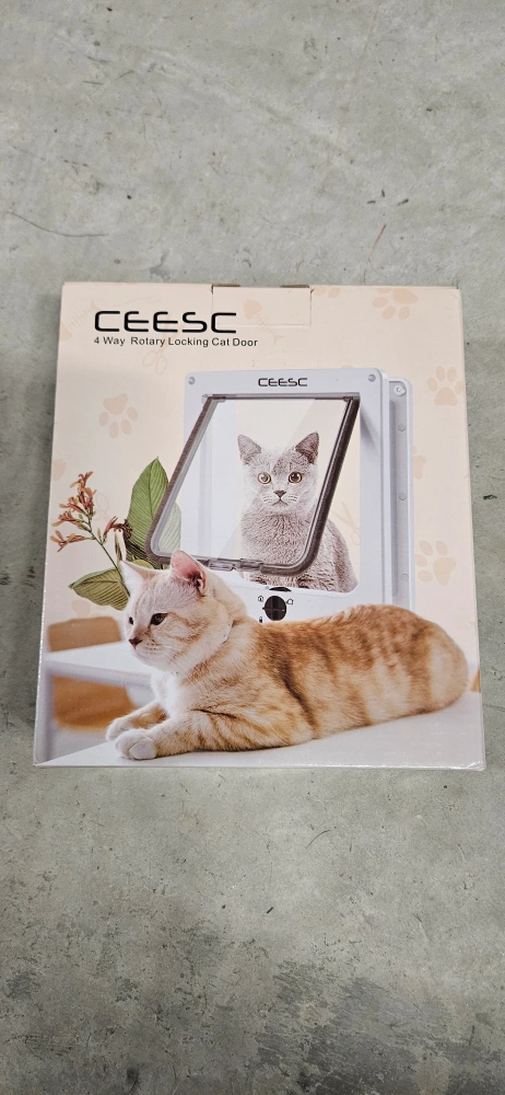Selling a used in box CEESC 4 Way Rotary Locking Cat Door! It's still in its original packaging and ready to be installed for your furry friend. Give your cat the freedom they deserve with this convenient and secure cat door