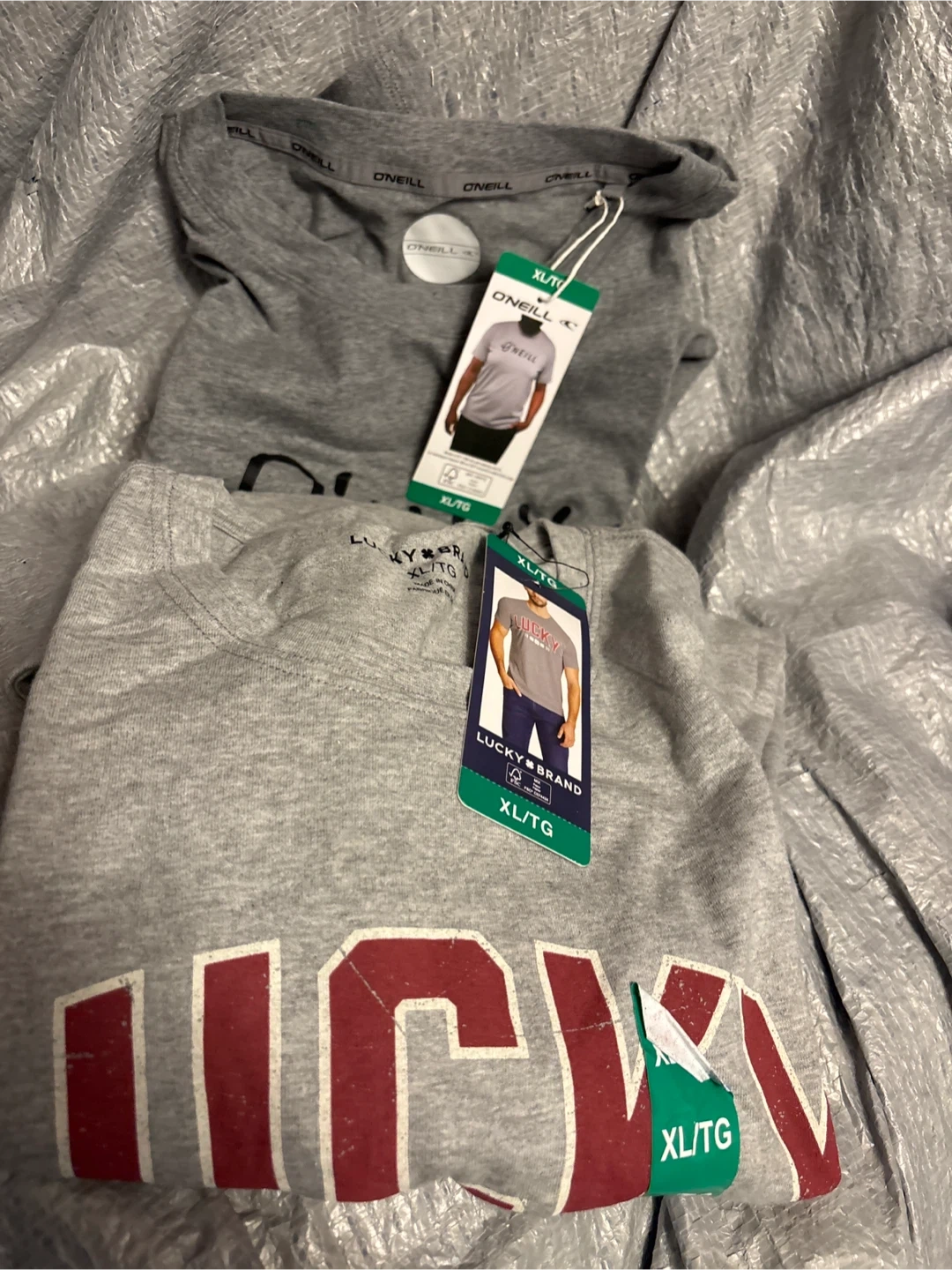Two grey t-shirts, one from O'Neill and one from Lucky Brand. Both are size XL/TG. Material appears to be a cotton blend. These are great basics for everyday wear!