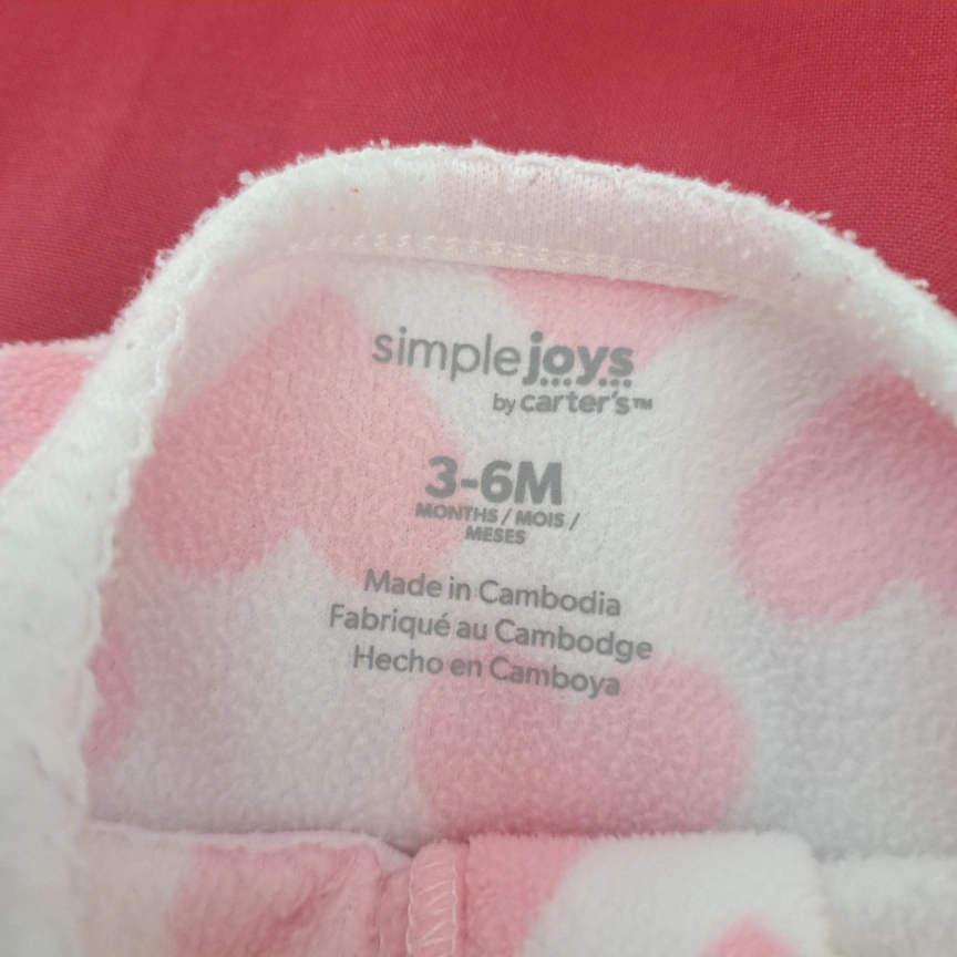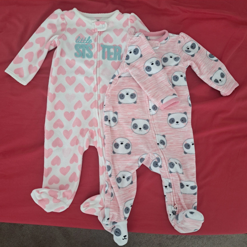 Two adorable fleece sleepers from Simple Joys by Carter's in size 3-6 months! They are very warm as they are for the winter months. One is pink with white hearts, and the other features a cute panda design. Perfect for keeping your little one comfy and cozy. Originally purchased on Amazon at $20 per pc.