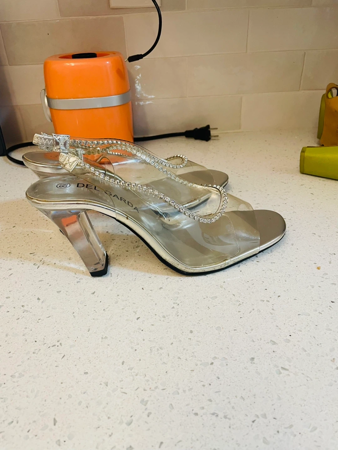 These Del Garda slingback heels feature a clear strap with rhinestone embellishments. The heel is a clear block style. They're perfect for adding a bit of sparkle to an evening outfit!