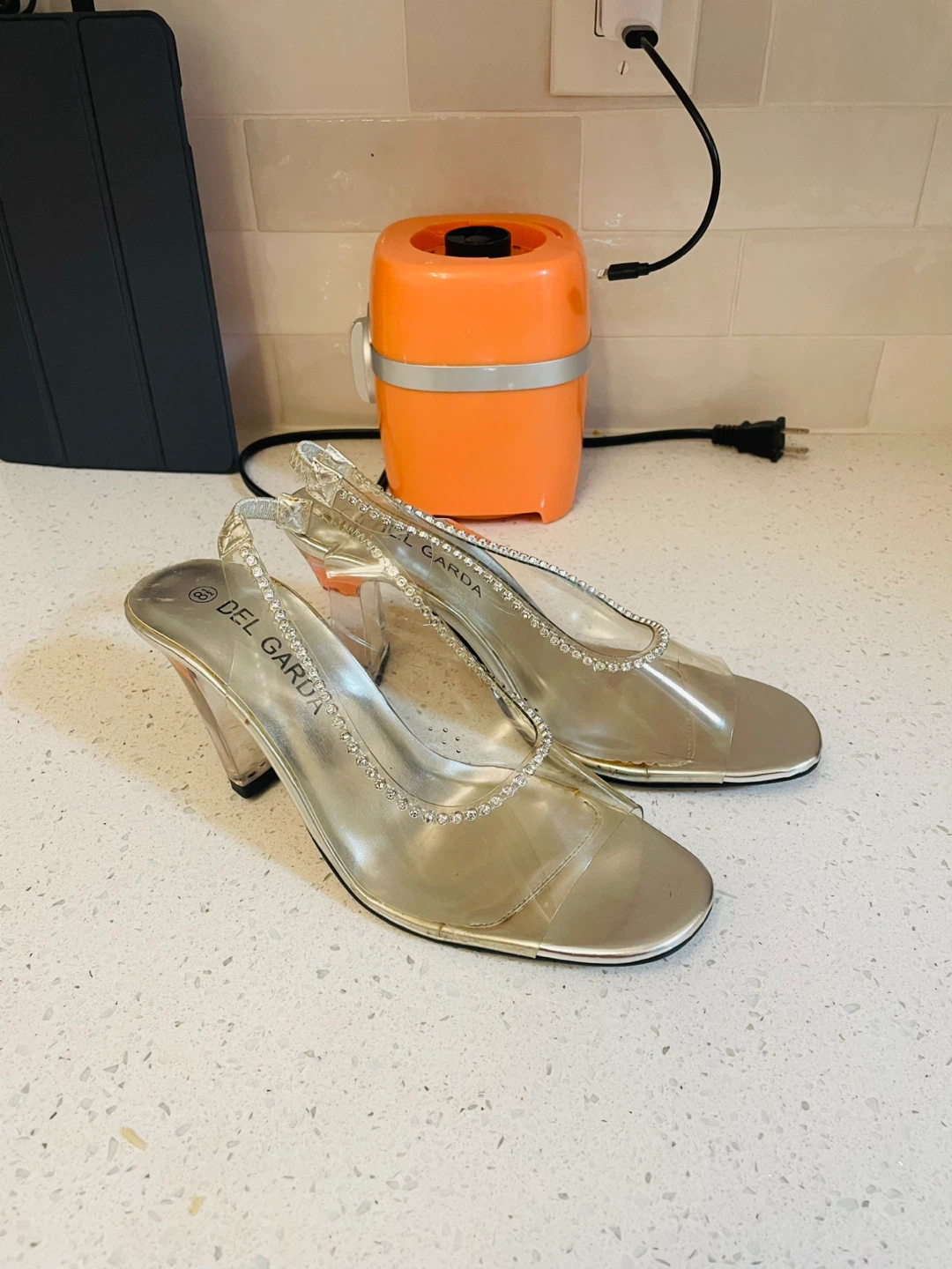 These Del Garda slingback heels feature a clear strap with rhinestone embellishments. The heel is a clear block style. They're perfect for adding a bit of sparkle to an evening outfit!