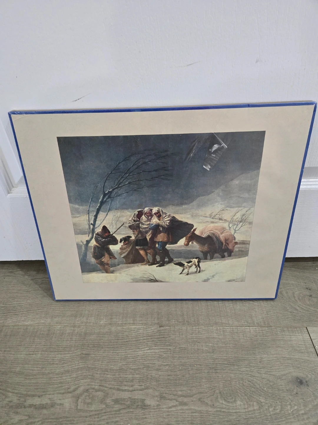 This is a framed art print depicting a vintage winter scene with people and animals. The print is old good condition and has a blue edging. It's a nice piece for home decor in an eclectic gallery wall.