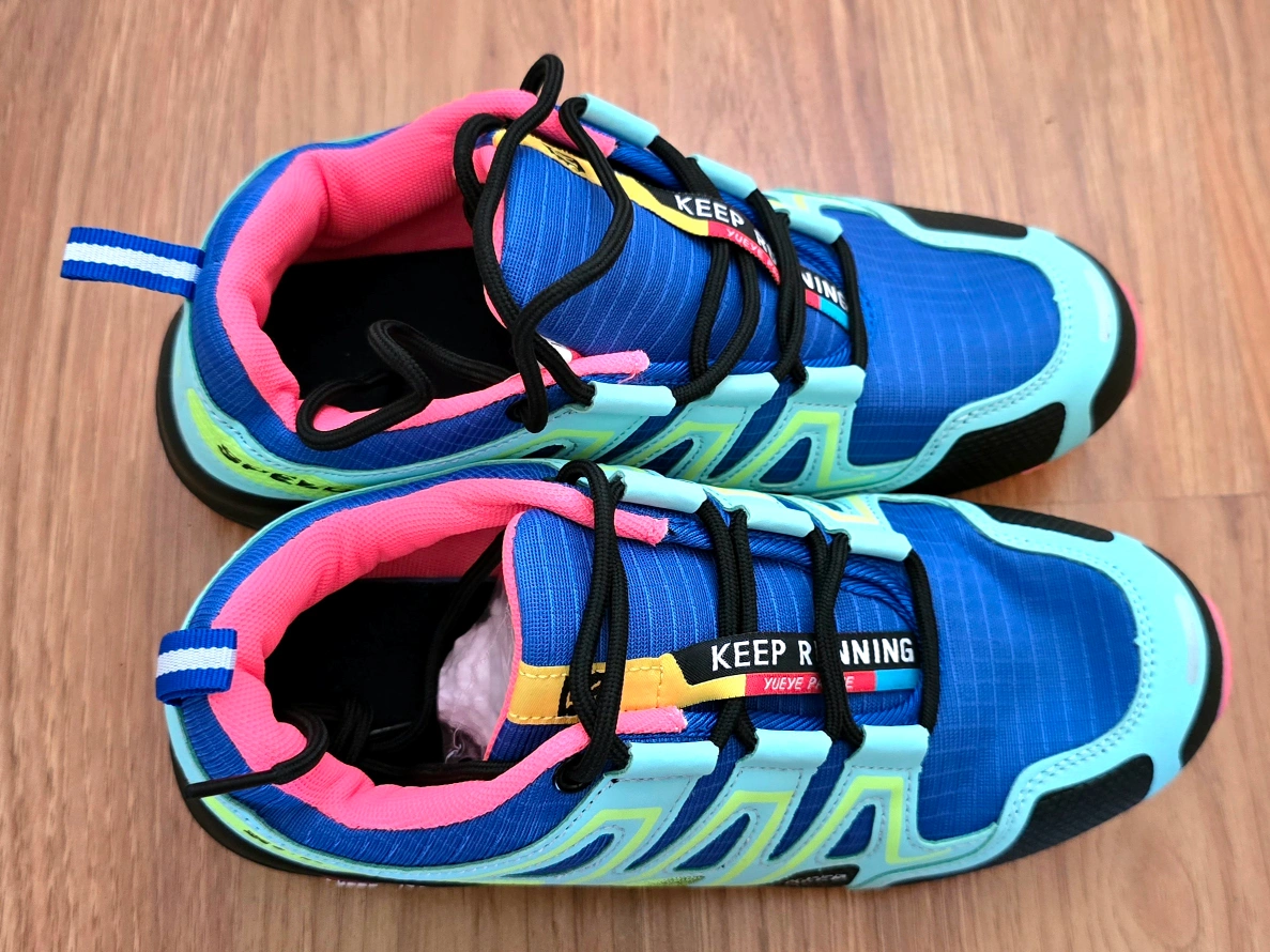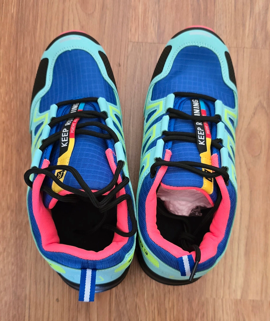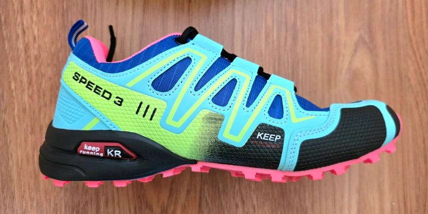 I'm selling a pair of Keep Running Speed 3 trail running shoes. They feature a vibrant blue, pink, and lime green colour scheme. Great for hitting the trails or just adding a pop of colour to your workout gear!