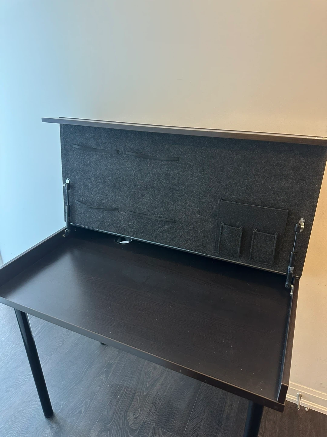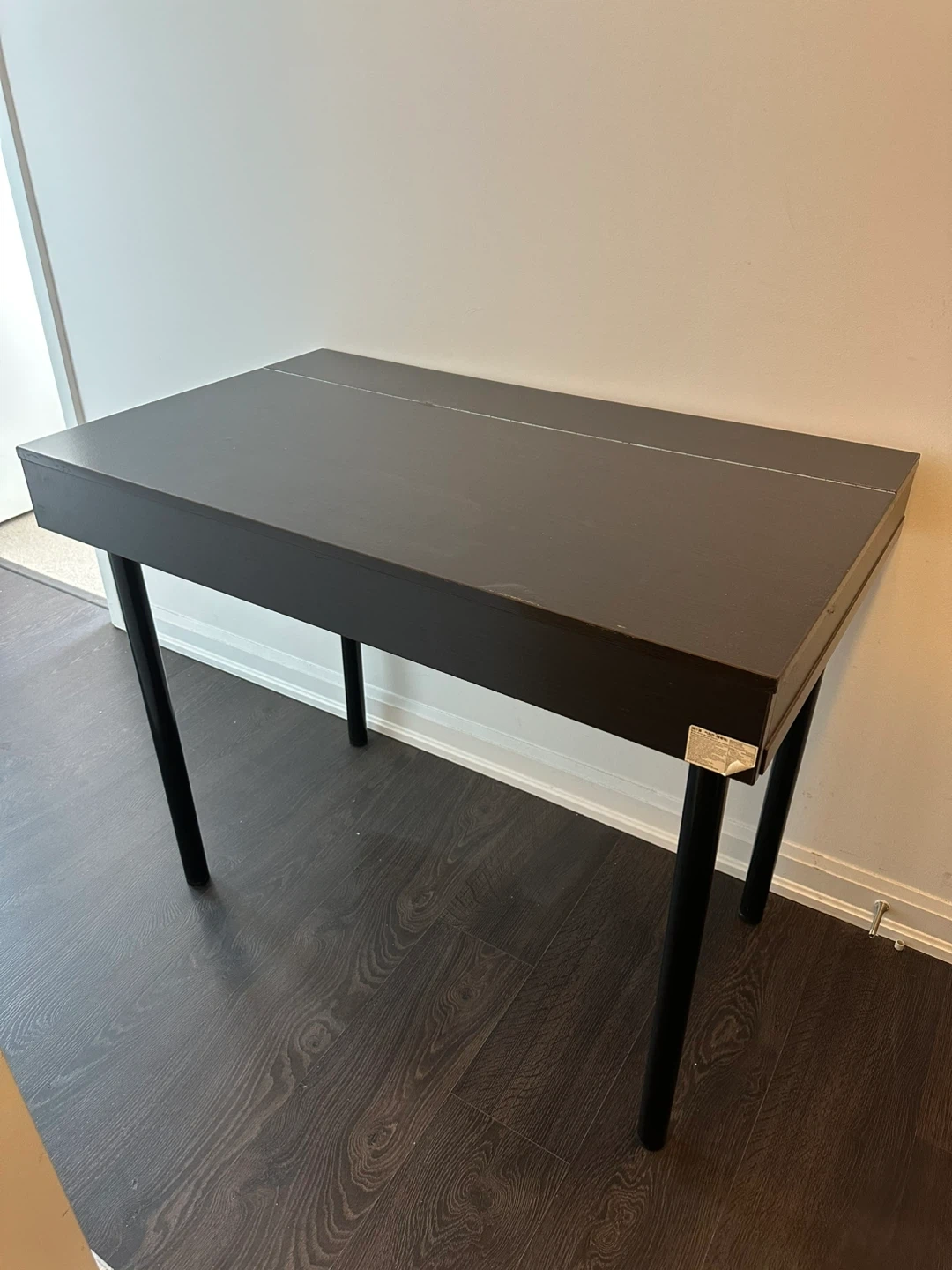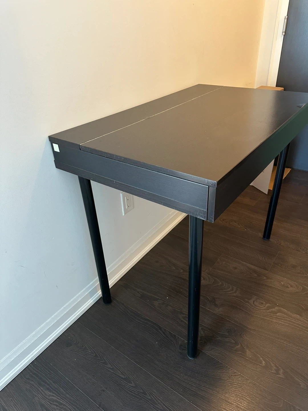 A stylish black desk with a hidden storage compartment under the tabletop. It's perfect for keeping your workspace tidy and organized. The desk features a sleek design and sturdy construction, making it a great addition to any home office or study area