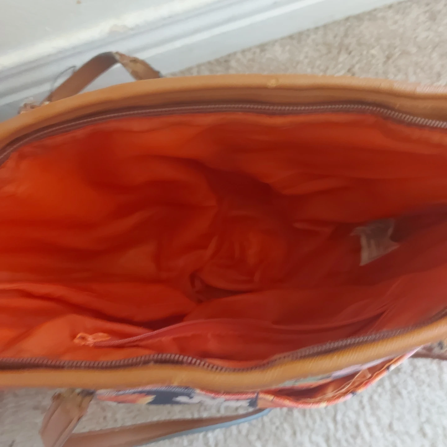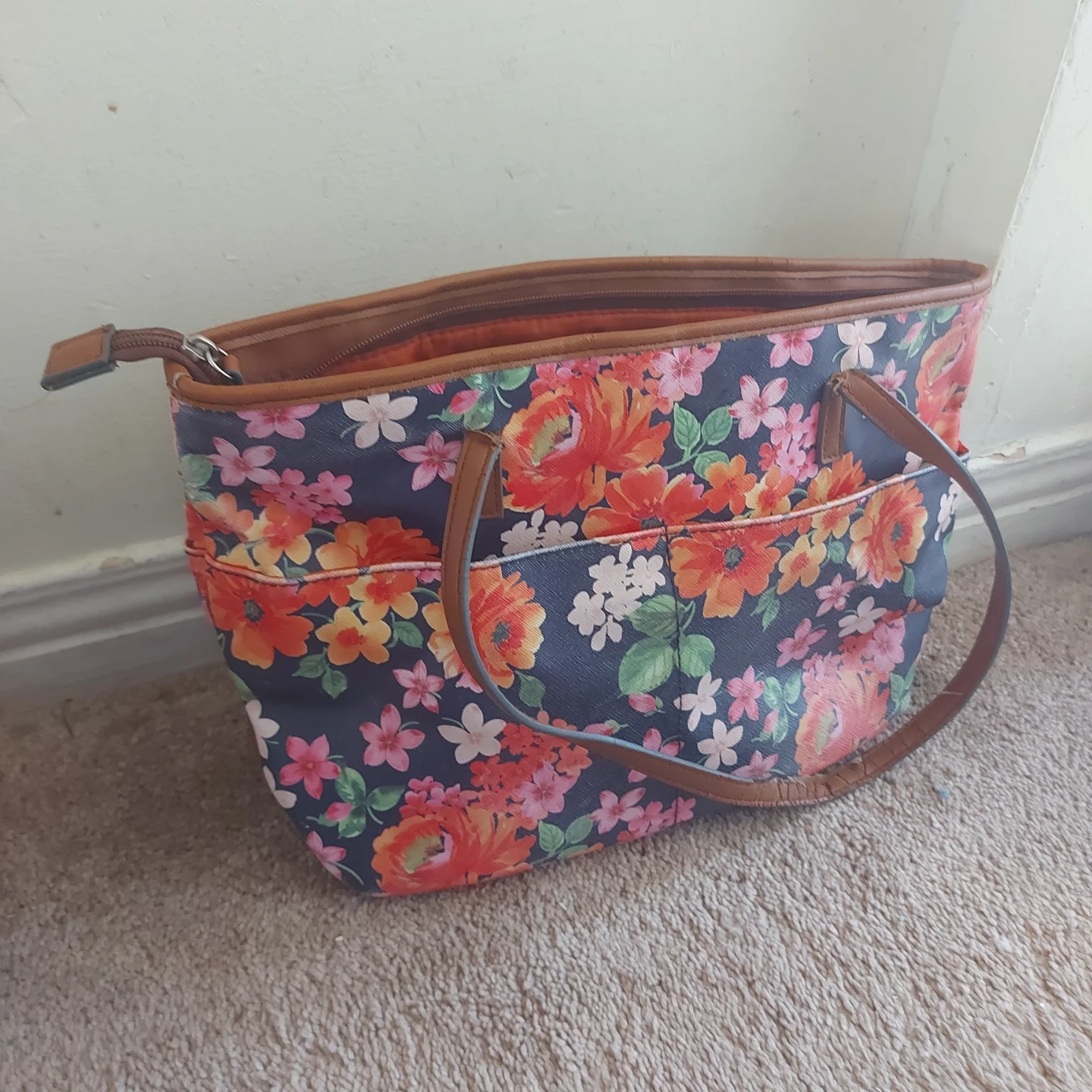 Colourful floral print tote bag with brown faux leather trim and handles. It has a zippered top closure and an orange interior lining. Lots of space for your essentials!