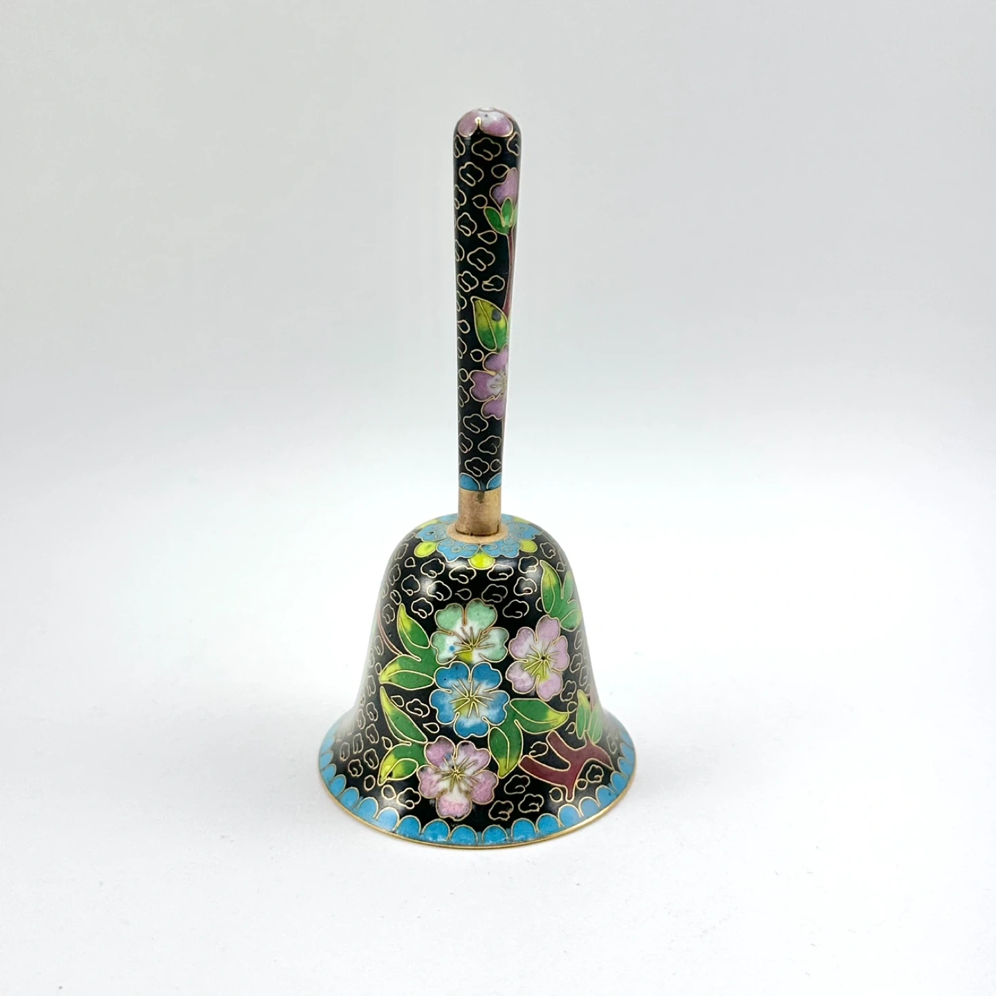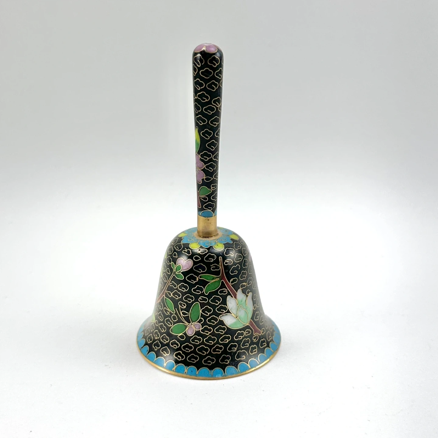 Cloisonné black bell with floral design, bell ball inside missing (price reflects this condition already). Measures 4.5” tall x 2.5” wide