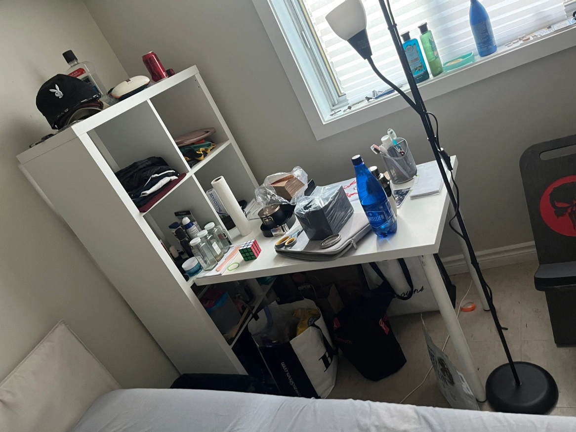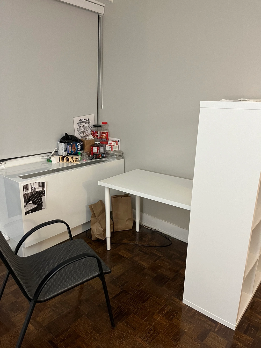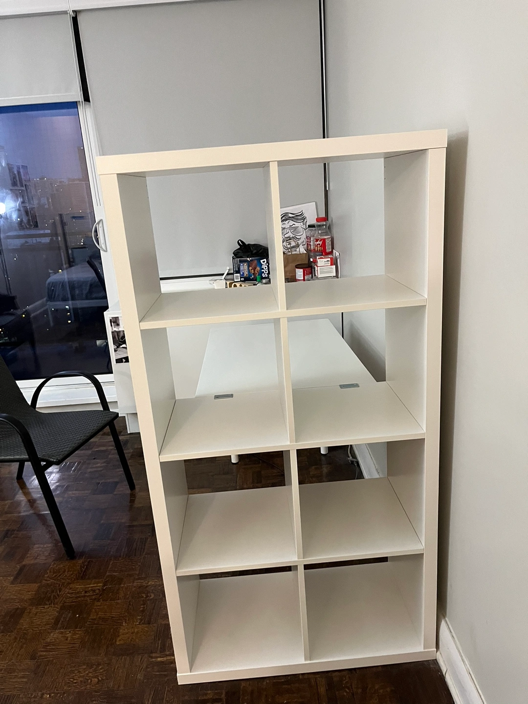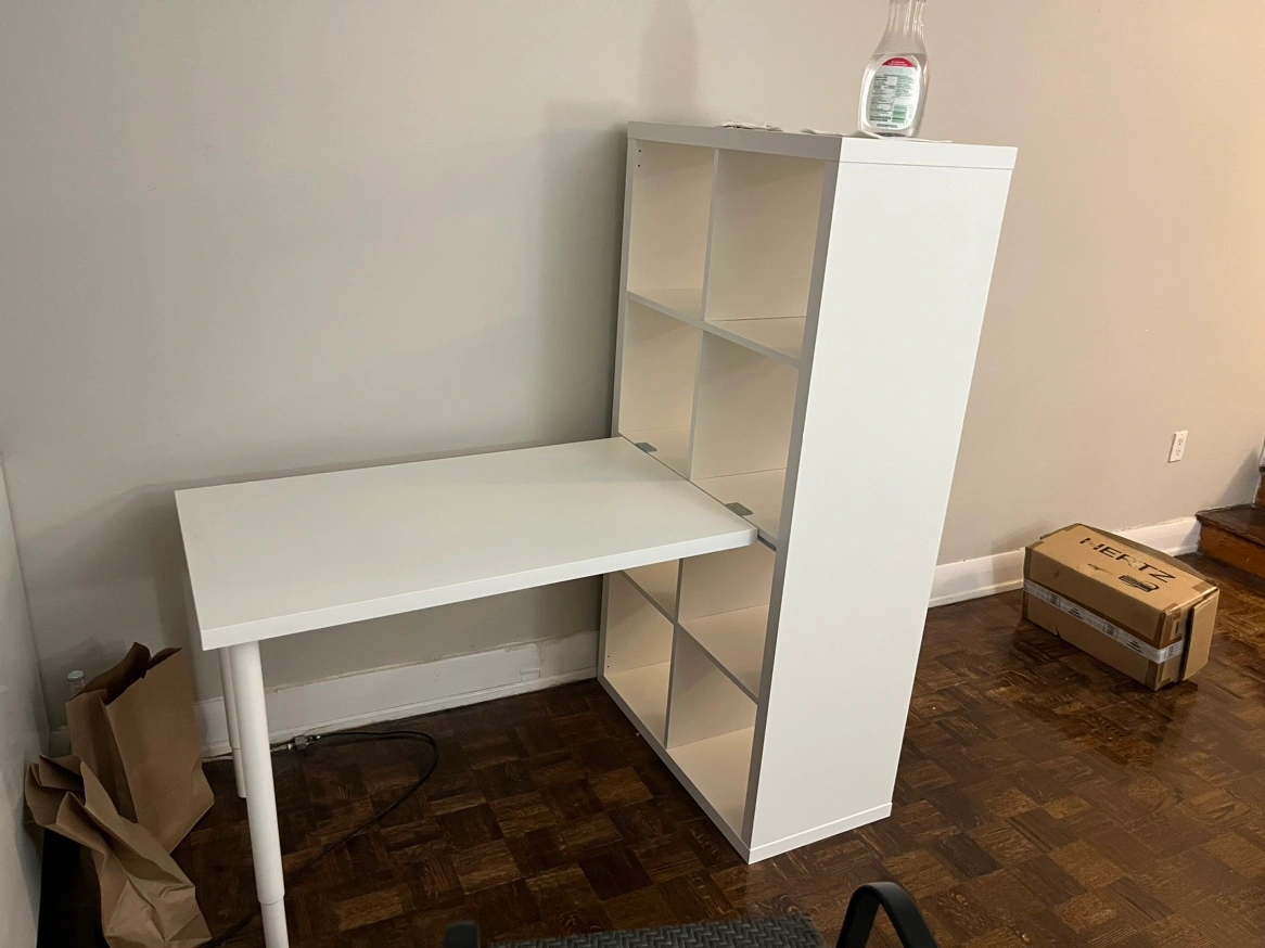 White Kallax shelving unit with attached desk.