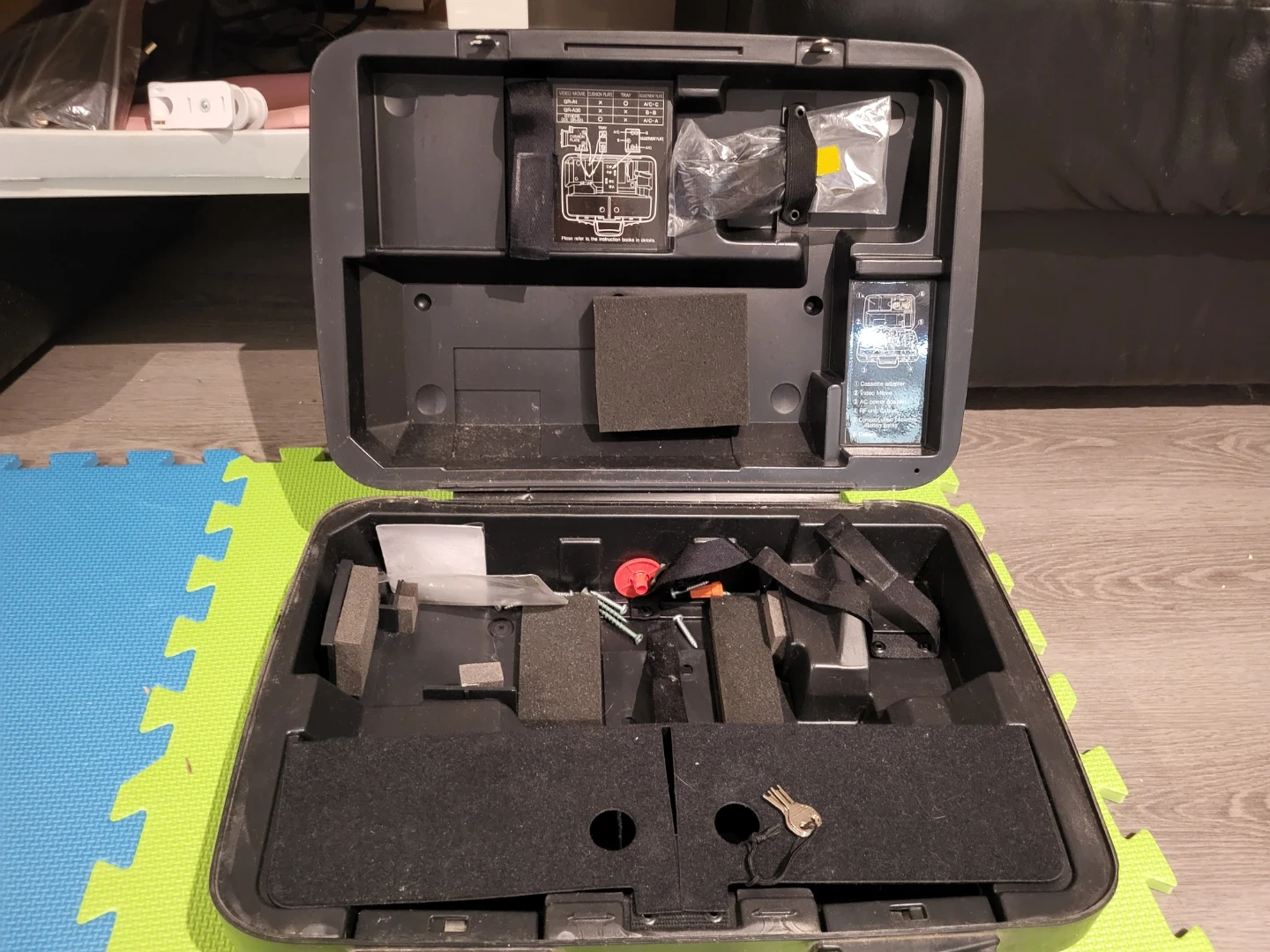 Vintage JVC video movie carrying case. Comes with various inserts and a key. Made of durable black plastic.