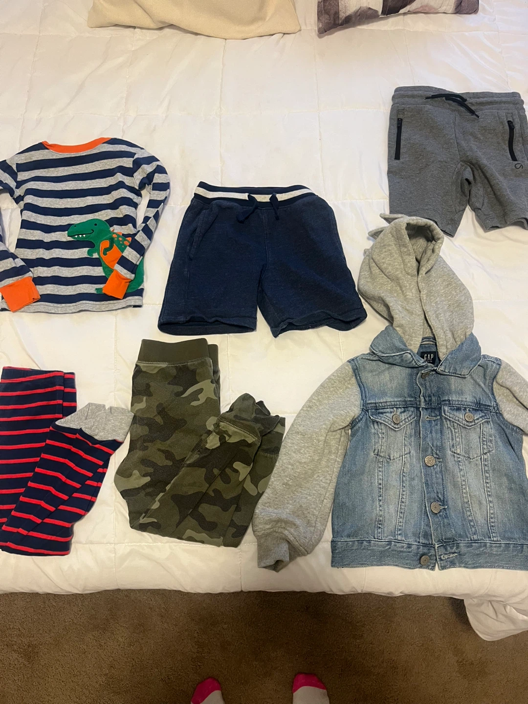 Bundle includes a long-sleeve dinosaur shirt, navy shorts, camo pants, a denim jacket with grey sleeves, grey shorts, and striped pants with socks. Some items are Gap brand.