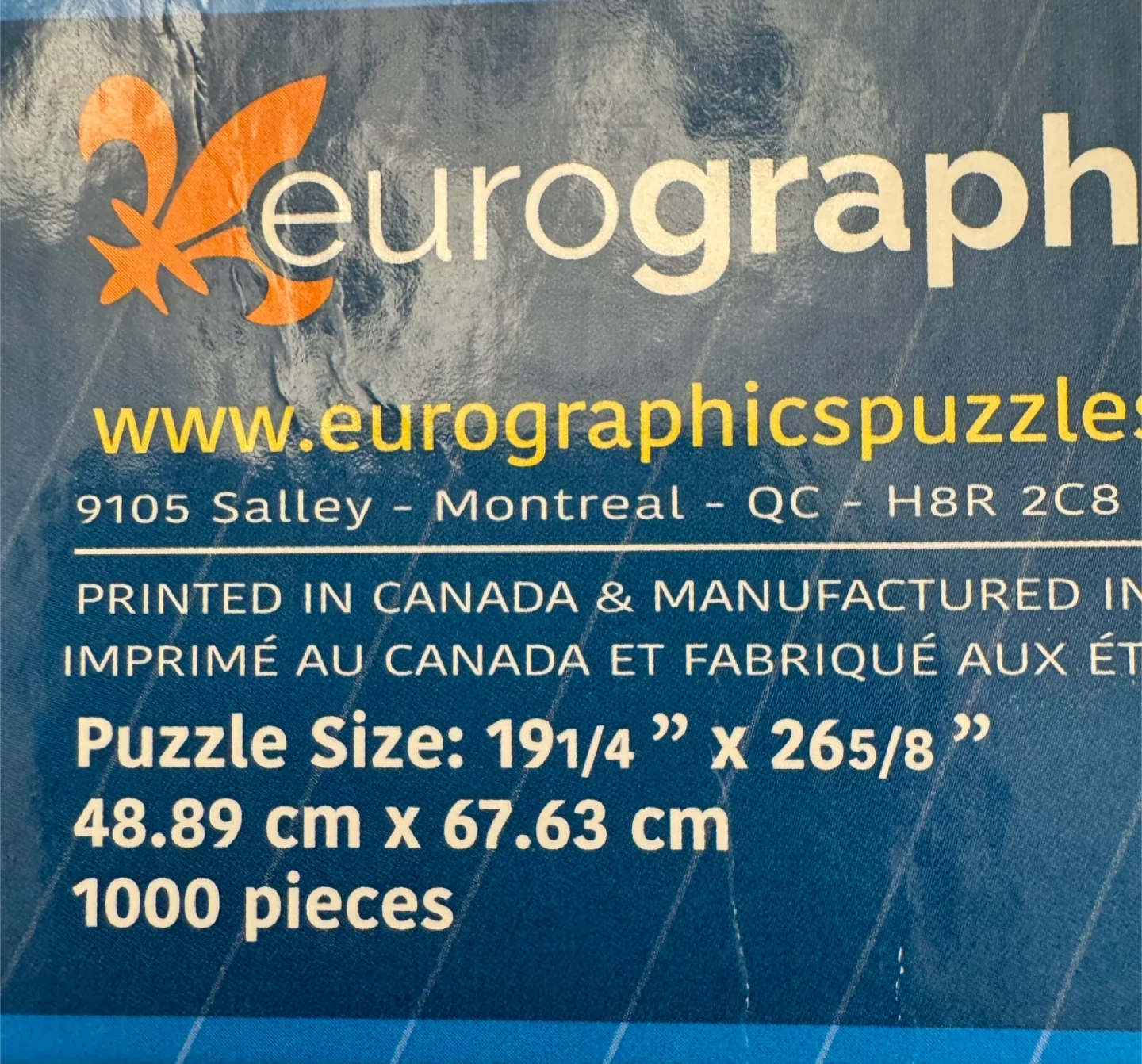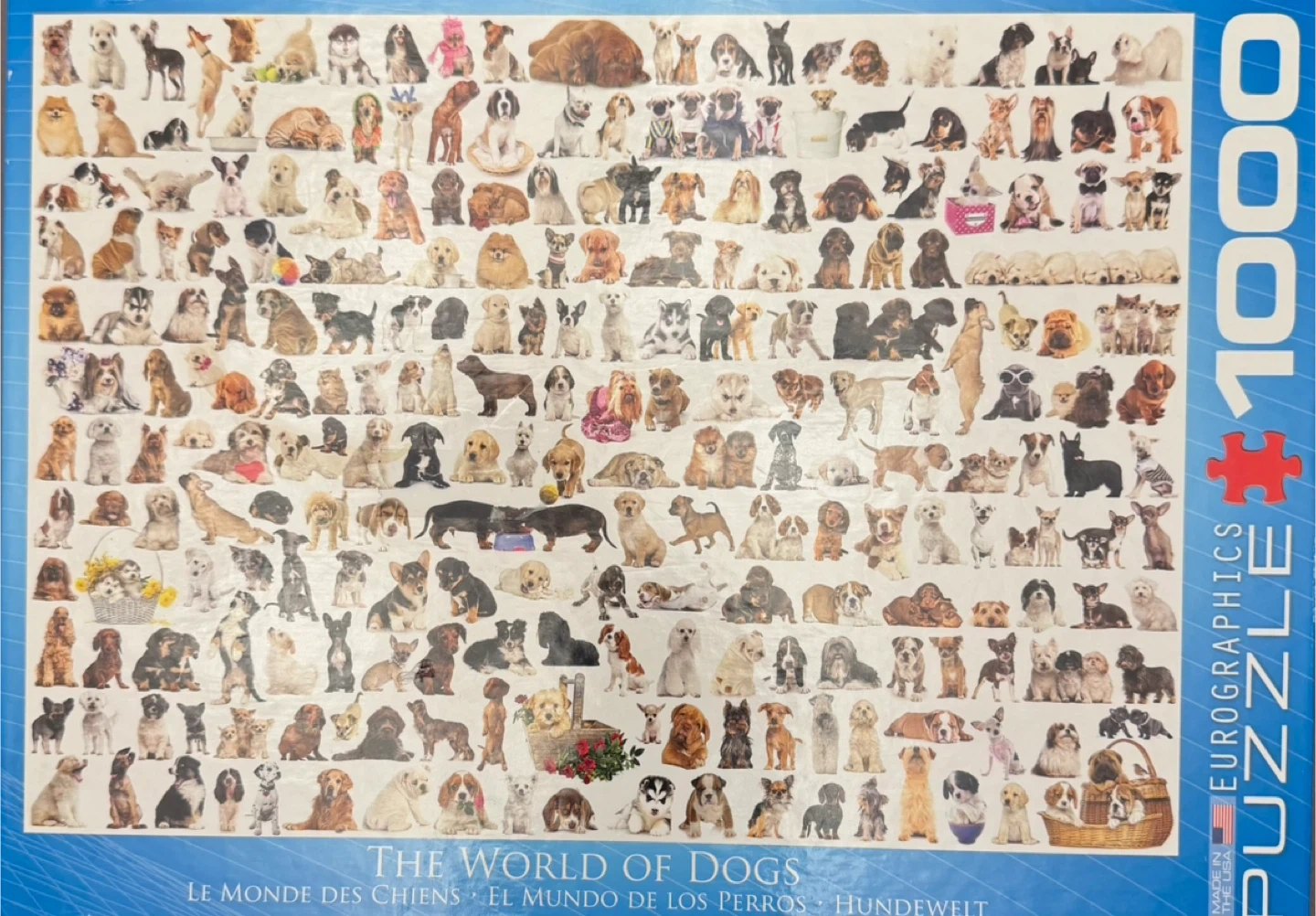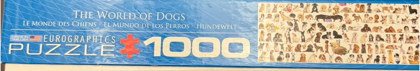 This Eurographics puzzle features "The World of Dogs" with 1000 pieces. Puzzle size is 19 1/4" x 26 5/8" (48.89 cm x 67.63 cm). It's printed and manufactured in Canada. Perfect for dog lovers looking for a challenge!