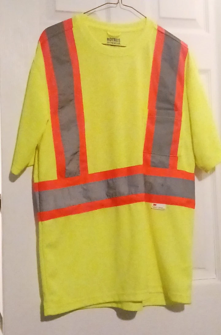 This is a Holmes Workwear high-visibility safety t-shirt. It's a bright yellow colour with reflective stripes on the front and back. The size is M/L. It's made for increased visibility on the job!