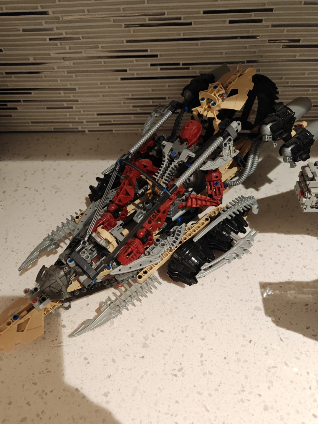 Selling a Lego Bionicle vehicle set! It's in great shape and ready for a new builder. The set features a cool design with black, beige, red, and grey pieces. It's a great addition to any Lego collection