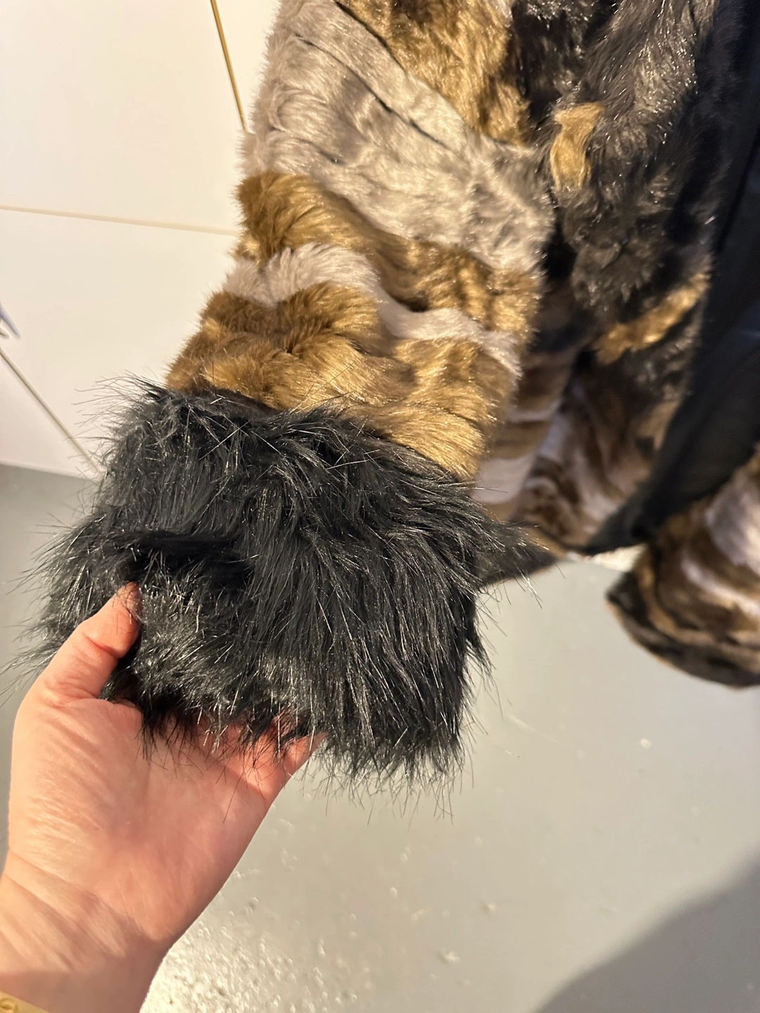 Hardly worn. Gorgeous faux fur coat. Multicoloured stripes. Black cuffs. Size medium.