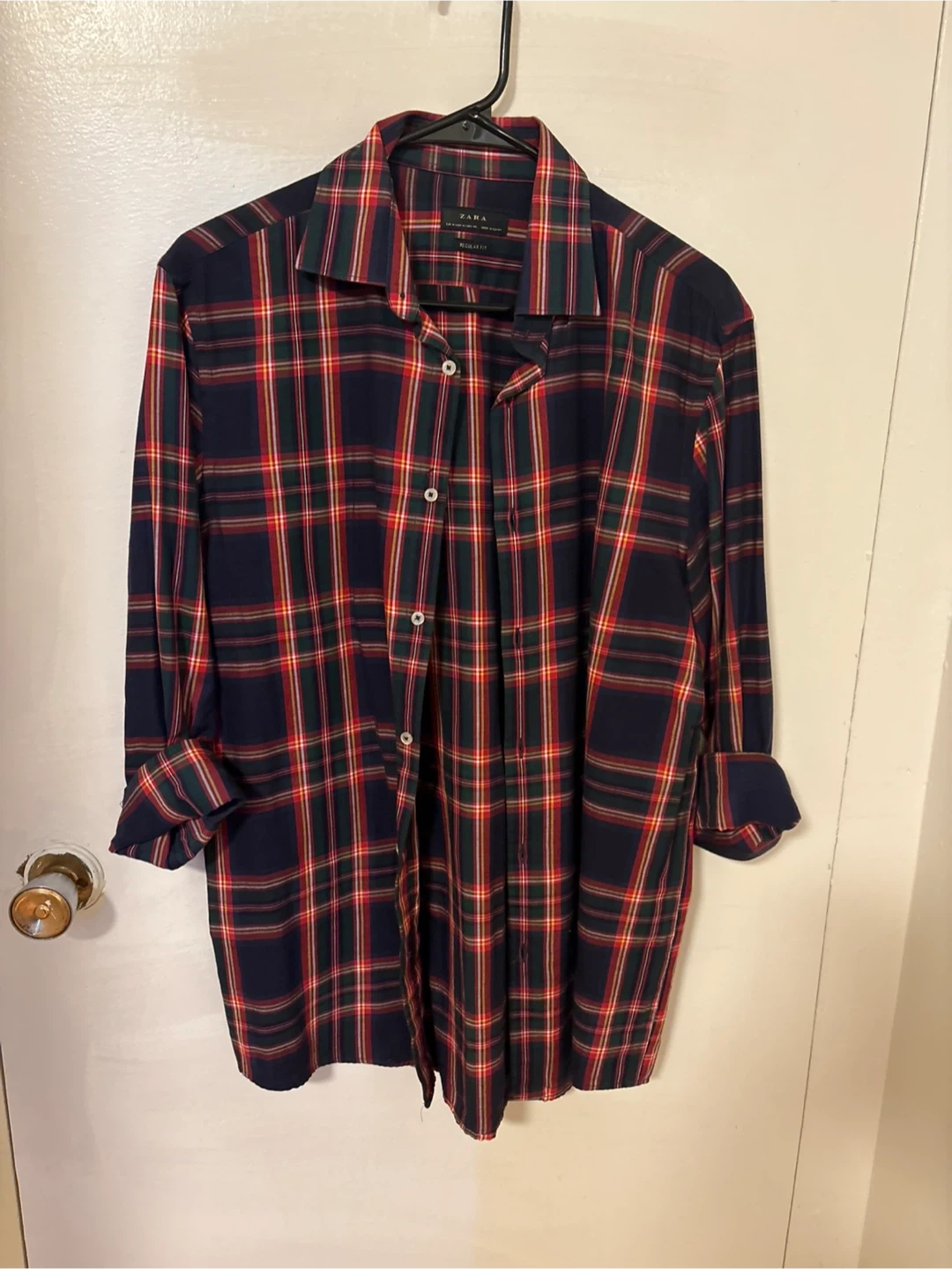 This ZARA men's shirt features a classic plaid pattern in a regular fit. It's a long-sleeve button-up style. Made for comfort and everyday wear.