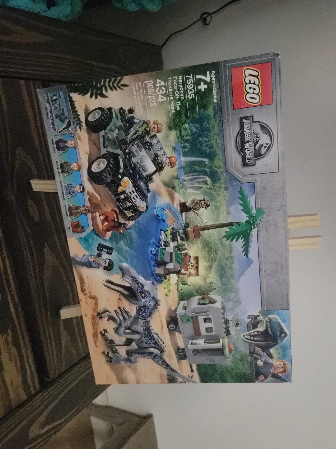 Selling a LEGO Jurassic World Baryonyx Dinosaur Boat Escape set (75935). It's suitable for ages 7+. The set includes 434 pieces for building a fun dinosaur adventure!
