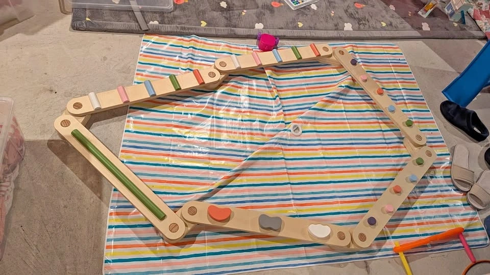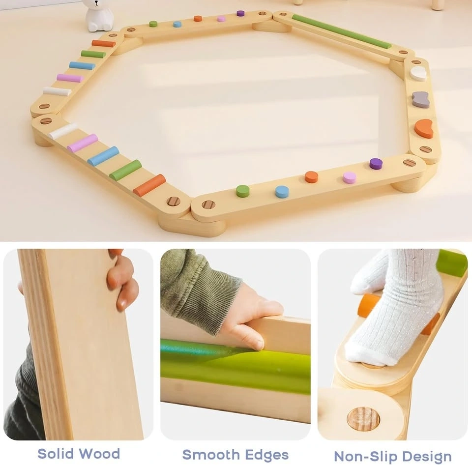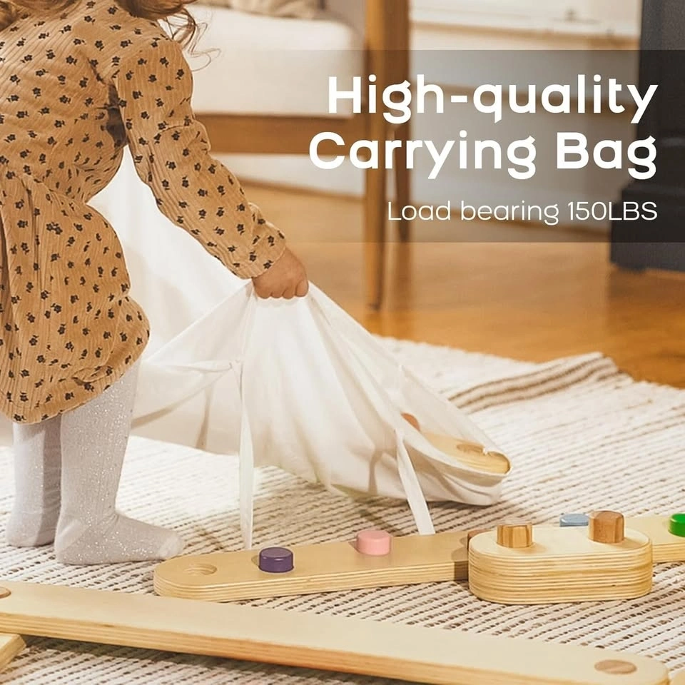 Made from premium birch wood with water-based paint and lacquer. Meets US and EU safety standards, with a smooth surface free of burrs for safe play. Includes 6 beams that can be arranged in various shapes like straight, zig-zagged, or polygonal. The double-sided design has a flat side and a side with colorful stepping stones to stimulate feet and improve balance. Vibrant colors also help with color recognition. Comes with a carrying bag for easy transport and storage, suitable for indoor or outdoor use. Helps kids improve balance, coordination, strengthen muscles, release energy, enhance concentration, and build confidence. Each beam measures 29.13"x3.54"x0.79" and supports up to 150lbs.