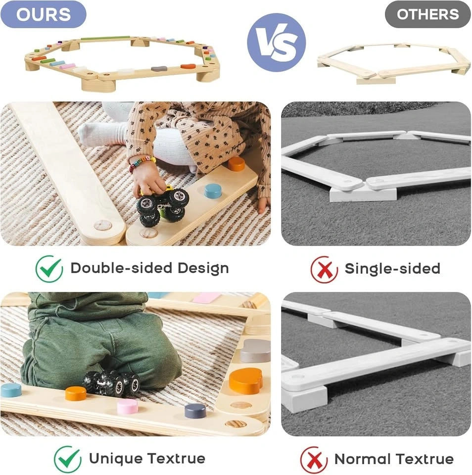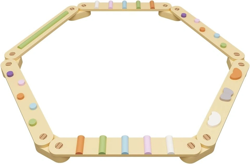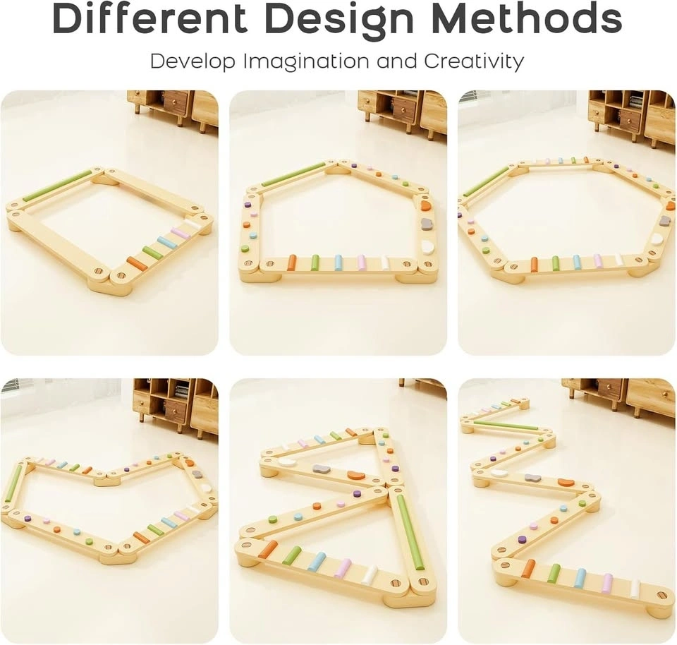 Made from premium birch wood with water-based paint and lacquer. Meets US and EU safety standards, with a smooth surface free of burrs for safe play. Includes 6 beams that can be arranged in various shapes like straight, zig-zagged, or polygonal. The double-sided design has a flat side and a side with colorful stepping stones to stimulate feet and improve balance. Vibrant colors also help with color recognition. Comes with a carrying bag for easy transport and storage, suitable for indoor or outdoor use. Helps kids improve balance, coordination, strengthen muscles, release energy, enhance concentration, and build confidence. Each beam measures 29.13"x3.54"x0.79" and supports up to 150lbs.