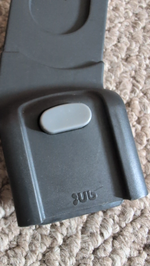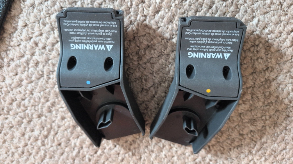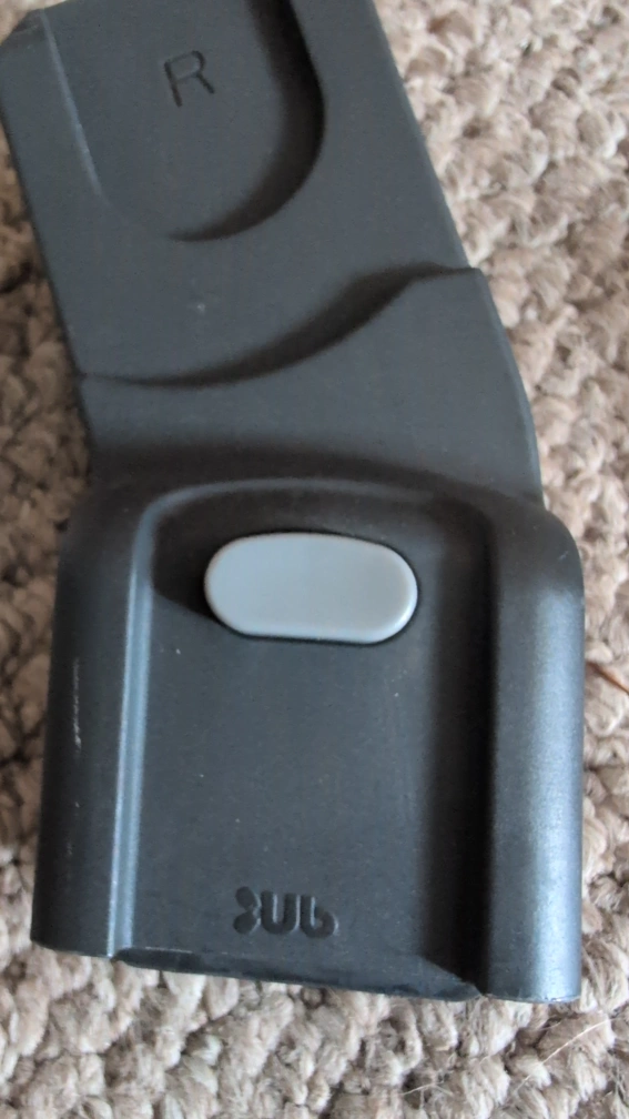 Set of two infant car seat adapters used with a Nuna PIPA car seat. Black plastic with a button feature. The pieces are marked with "R" and "L". These adapters can come in handy when transporting an infant in their car seat. No longer needed as infant has outgrown car seat.
