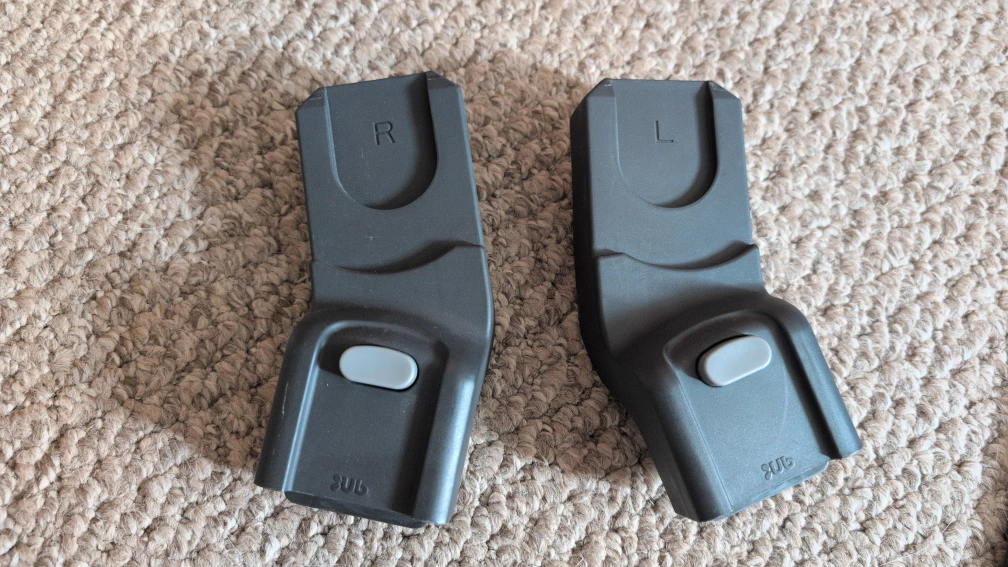 Set of two infant car seat adapters used with a Nuna PIPA car seat. Black plastic with a button feature. The pieces are marked with "R" and "L". These adapters can come in handy when transporting an infant in their car seat. No longer needed as infant has outgrown car seat.