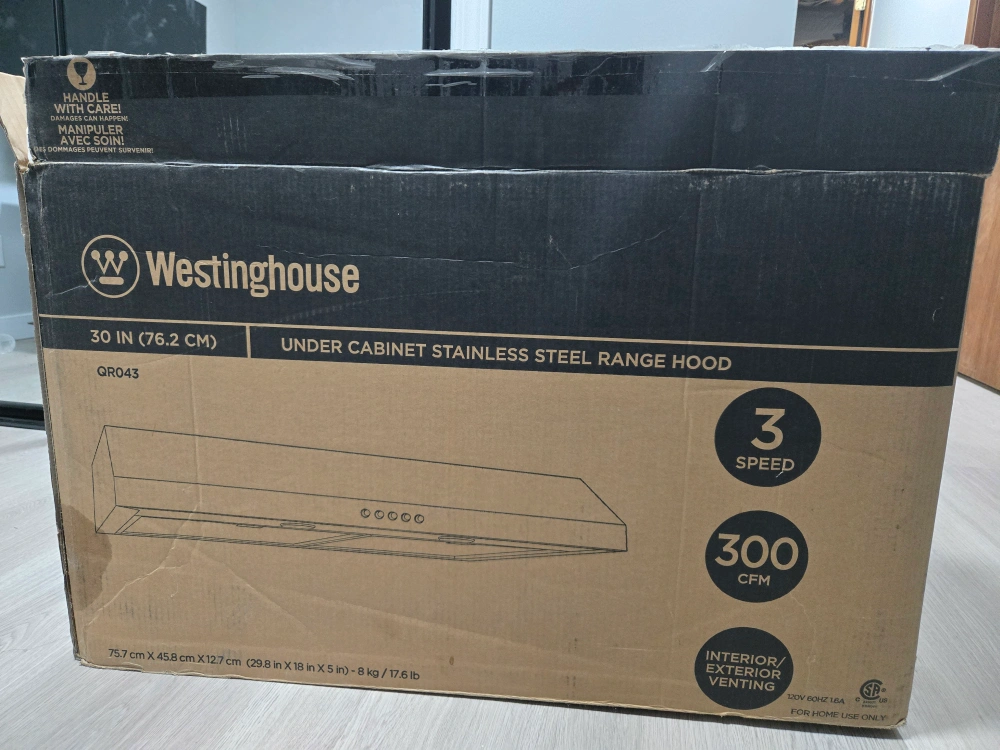 This is a Westinghouse 30 inch under cabinet range hood. It's stainless steel with 3 speeds and 300 CFM. It's designed for interior or exterior venting. it's totally brand new just open to check and change my mind asking for $200 or OBO.