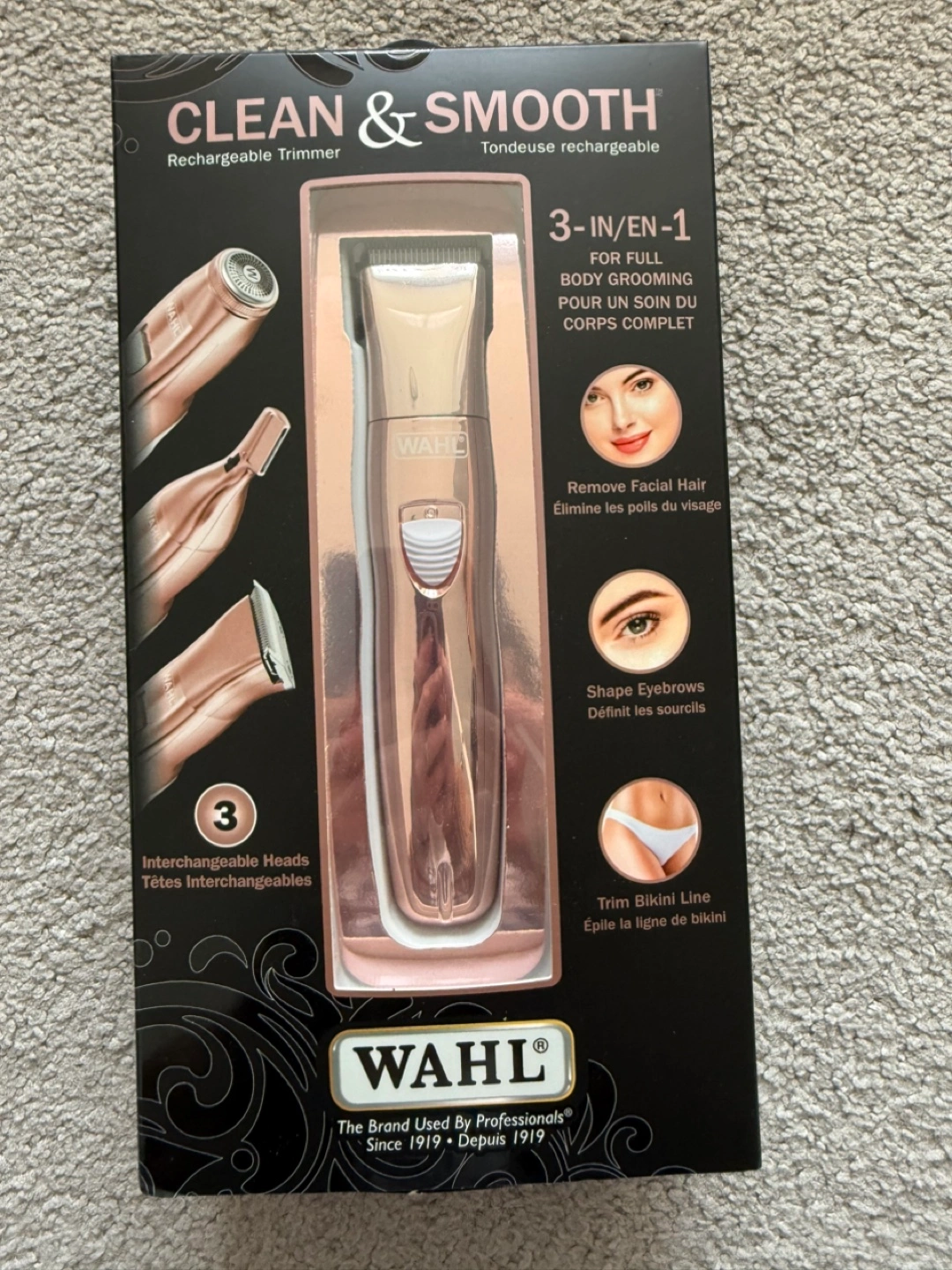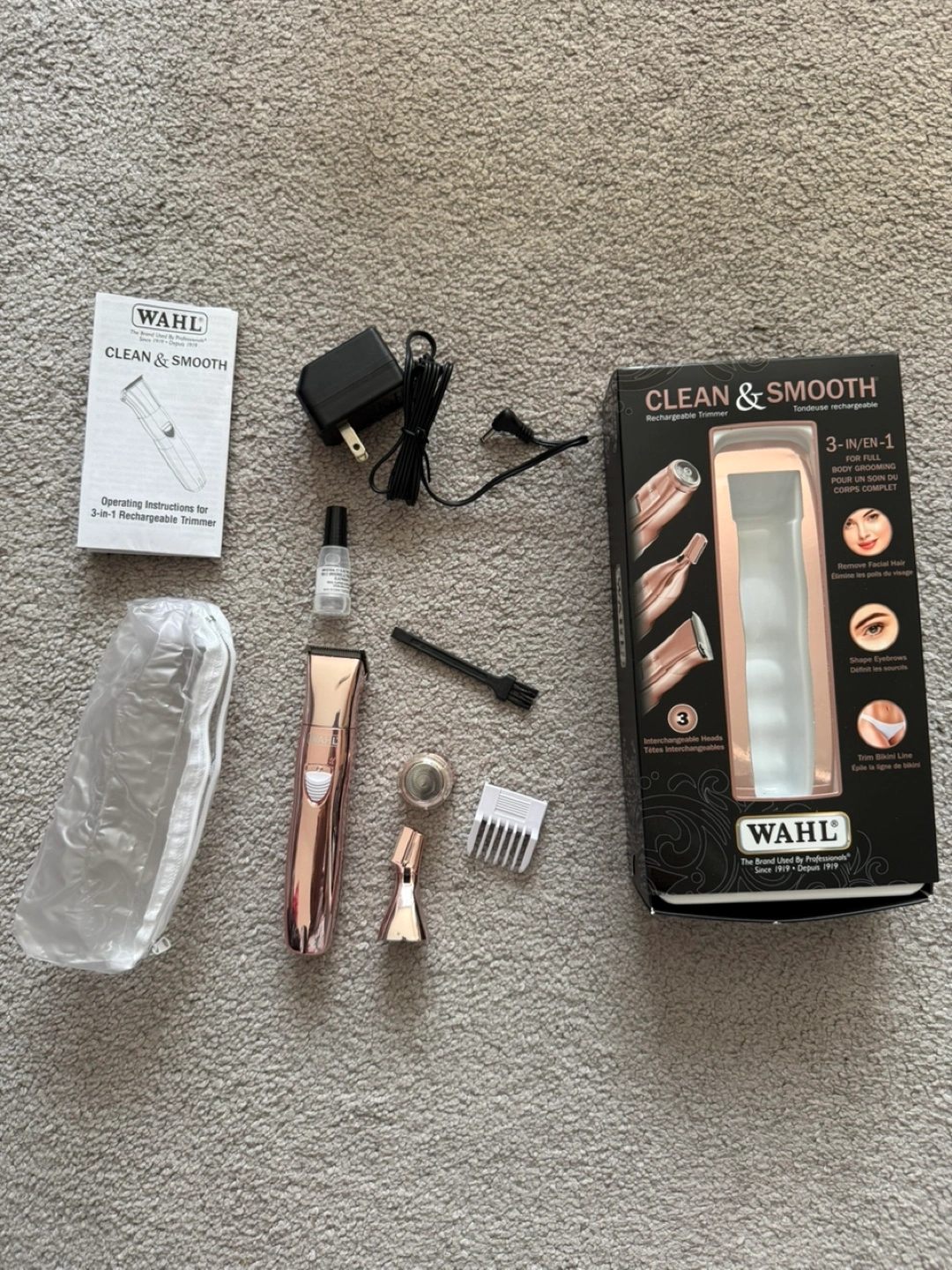 WAHL Clean & Smooth Rechargeable Trimmer in Rose Gold. Hair Removing 3in1 Rechargeable Trimmer, Ladies Grooming Kit with multi-functional heads.
