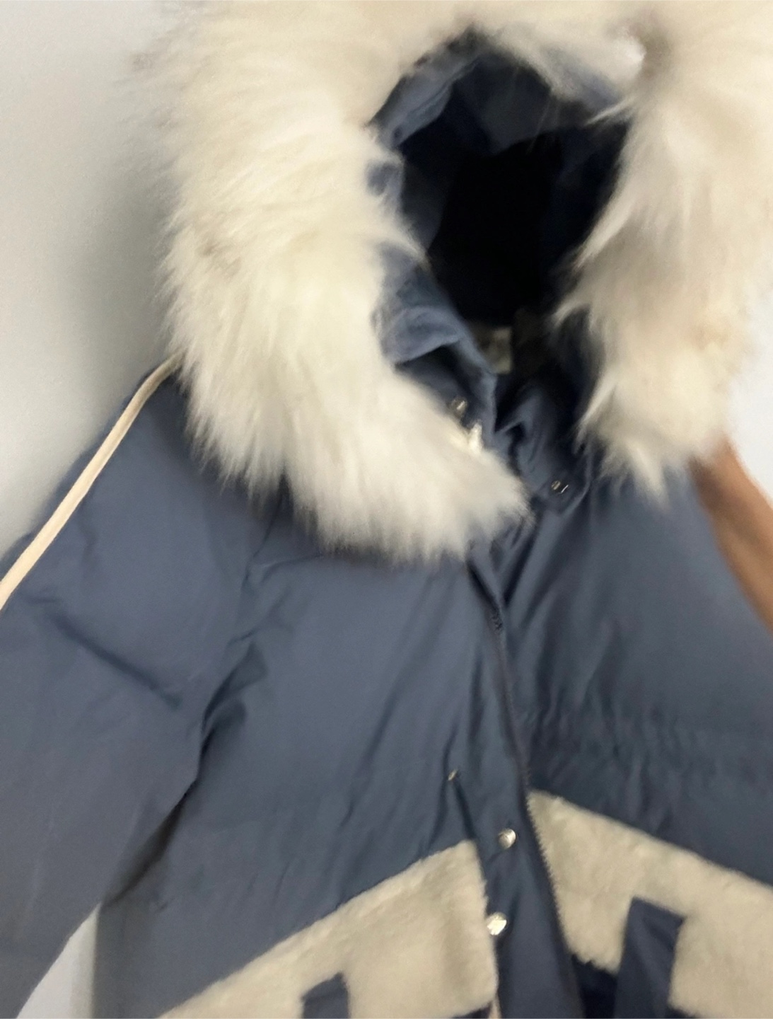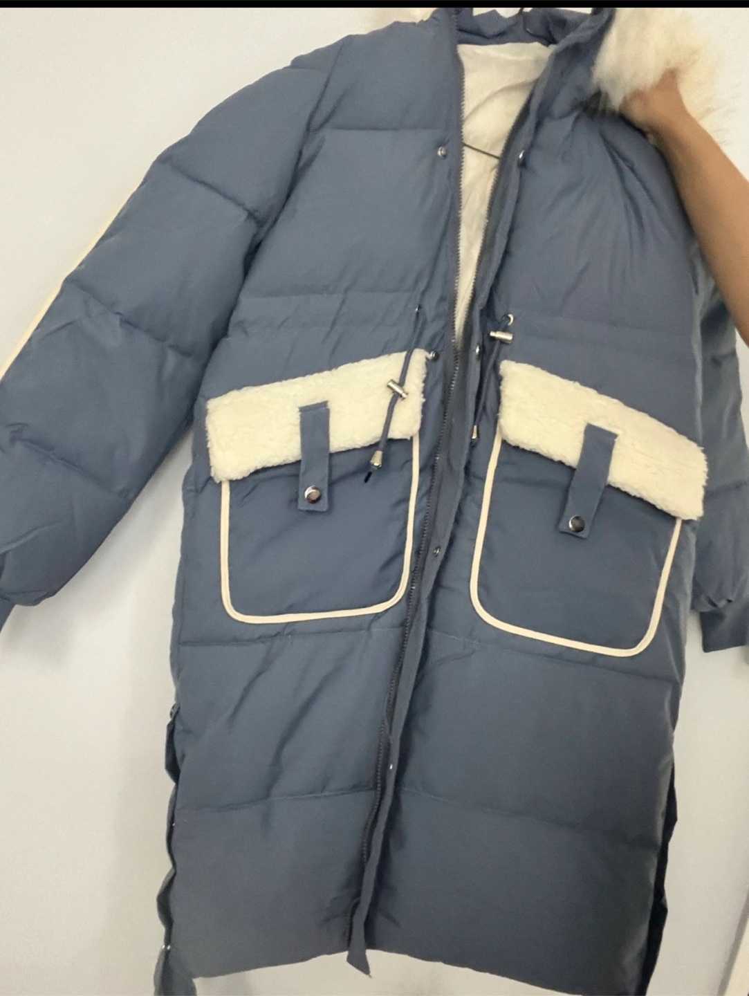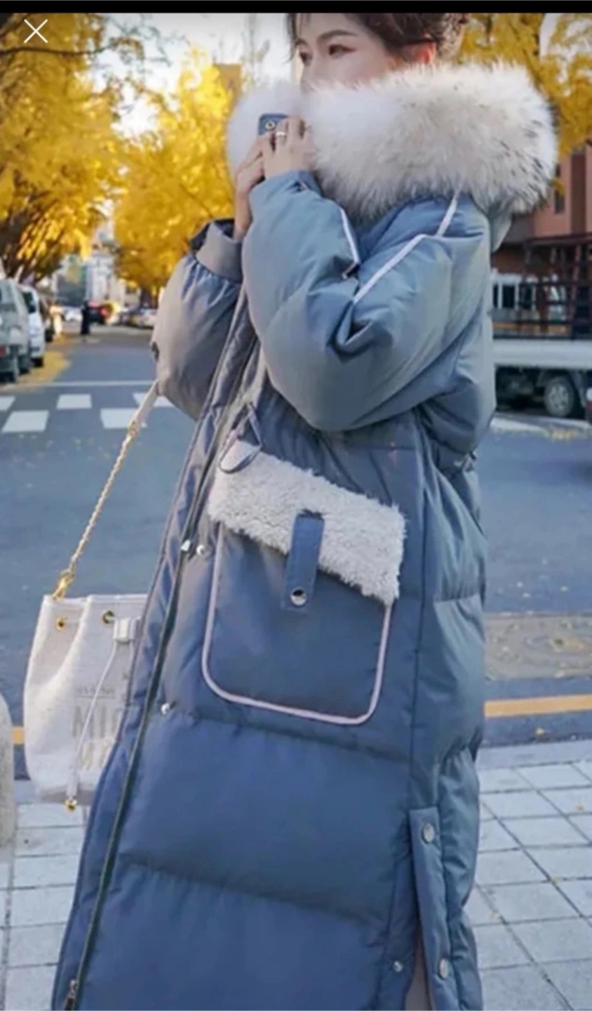 A stylish puffer coat in a lovely blue colour. It's got a fur-trimmed hood and some cute fur pocket details. Perfect for keeping warm this winter!