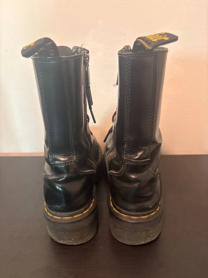 Super cute chunky black platform boots with lace-up front and that bold yellow stitching detail. Perfect for streetwear, grunge, alt fits, or just adding some edge to a basic outfit. They’ve been worn but still in great shape — lots of life left in them. Sturdy, comfy, and easy to style with jeans, cargos, skirts, literally anything.