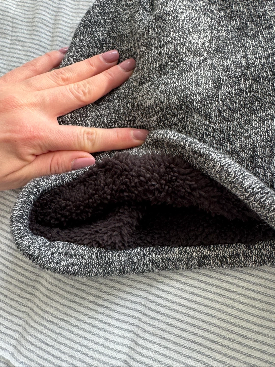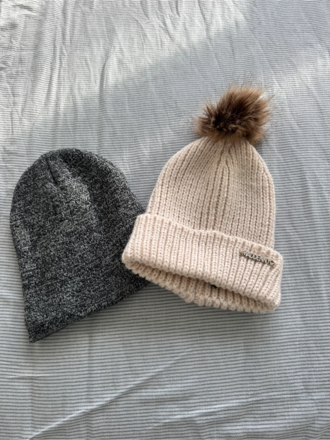 Two winter beanies, one grey knit (lined insidewith soft fleece for extra warmth) and one beige ribbed knit with a faux fur pom. The beige beanie is from Madden NYC.