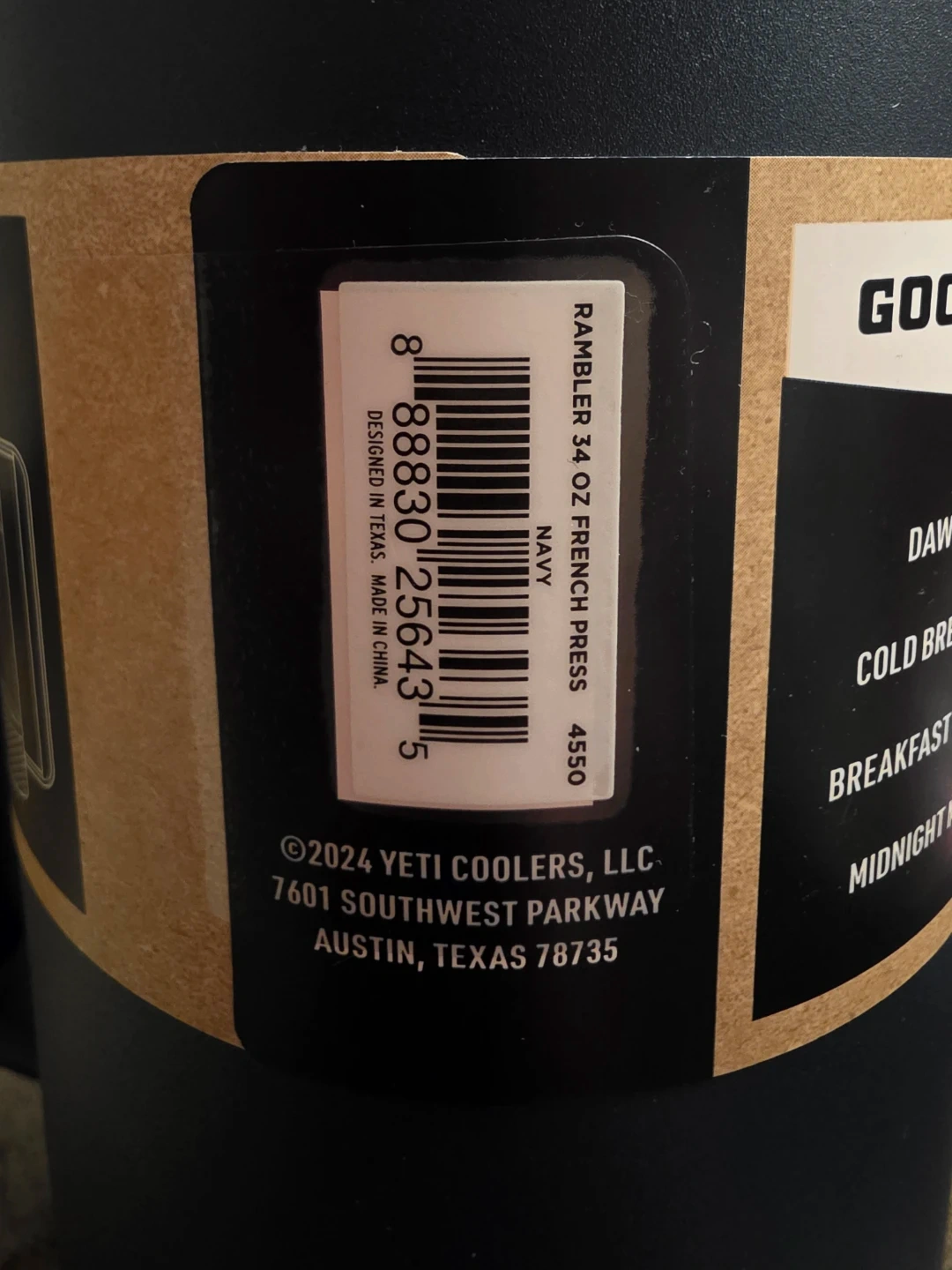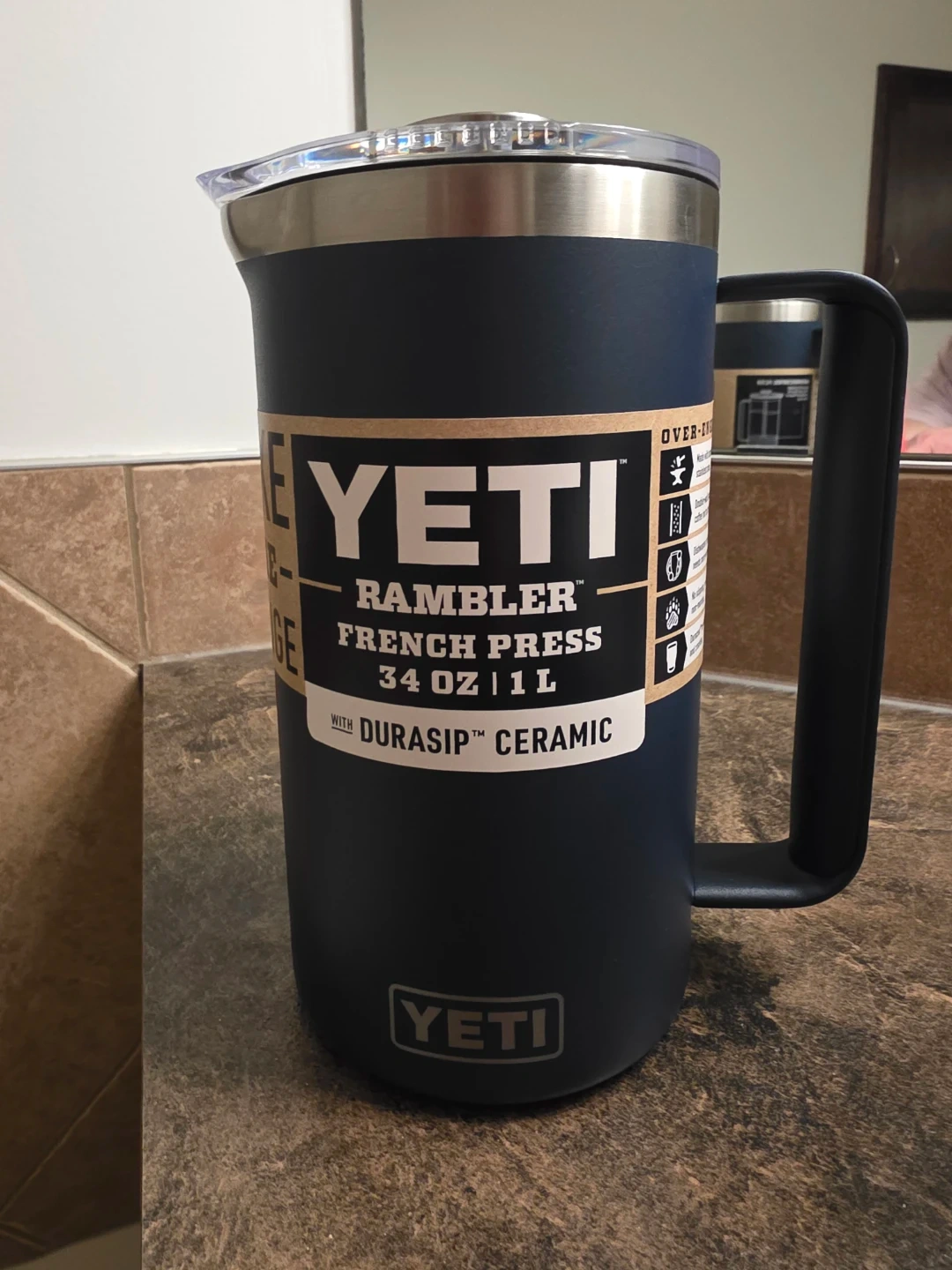 New! YETI Rambler French Press in navy. It's 34 oz/ 1L and made with durable kitchen-grade 18/8 stainless steel. Double-wall vacuum insulation keeps coffee hot, and it's dishwasher safe. No slipping, no sliding, and it's non-marking!