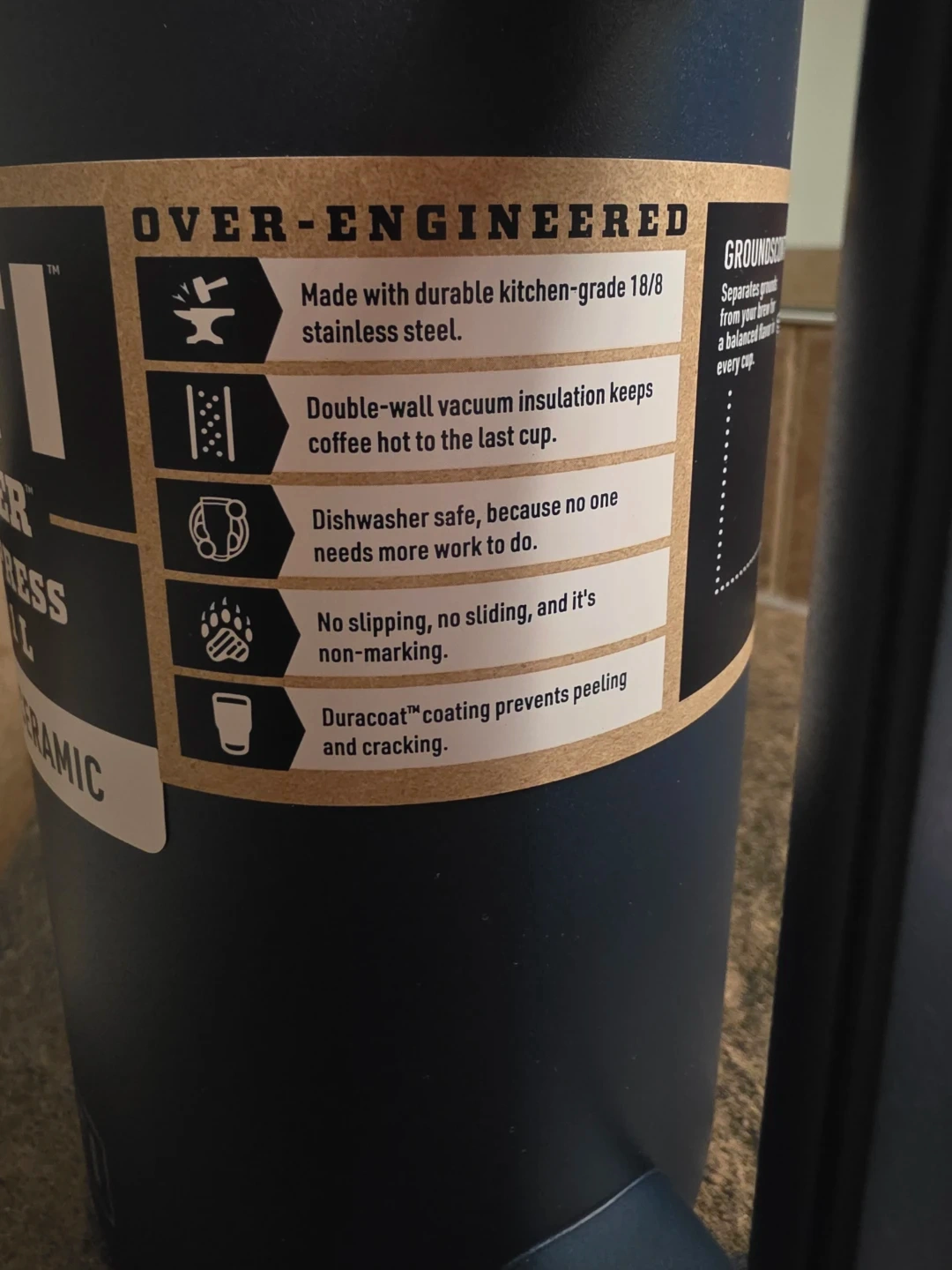 New! YETI Rambler French Press in navy. It's 34 oz/ 1L and made with durable kitchen-grade 18/8 stainless steel. Double-wall vacuum insulation keeps coffee hot, and it's dishwasher safe. No slipping, no sliding, and it's non-marking!