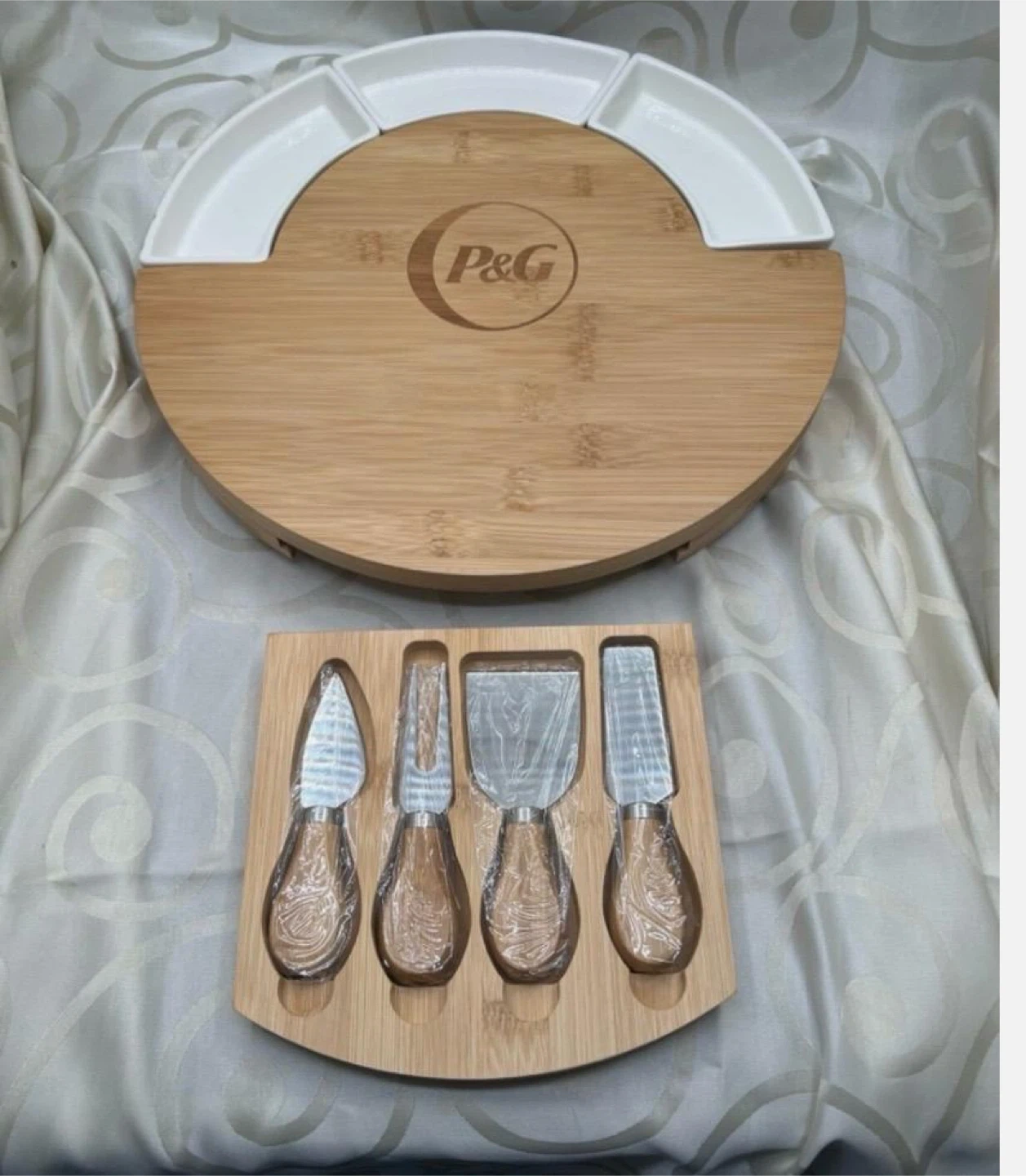 Beautiful bamboo charcuterie board comes with 4 knives, 1 board, and 3 ceramic bowls. The board is round and medium-sized, featuring a bamboo wood design.