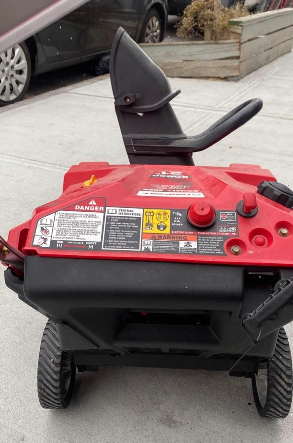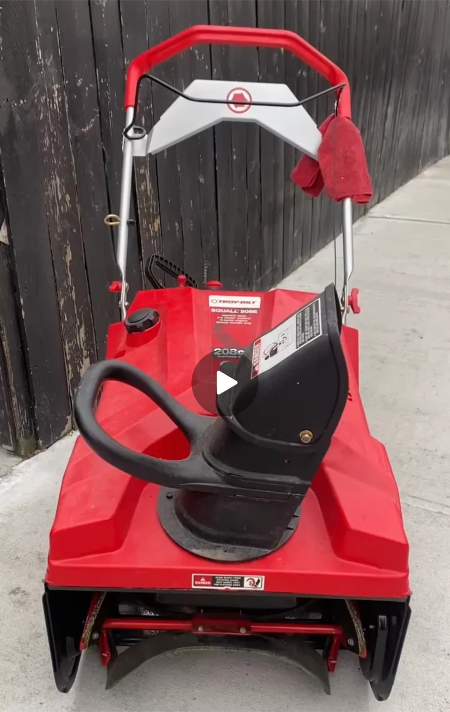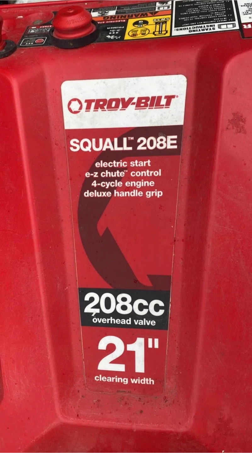 Troy-Bilt Squall 208E snow blower. It has electric start, e-z chute control, and a 4-cycle engine. Features a 21" clearing width and 208cc overhead valve engine. Great for clearing driveways and sidewalks!