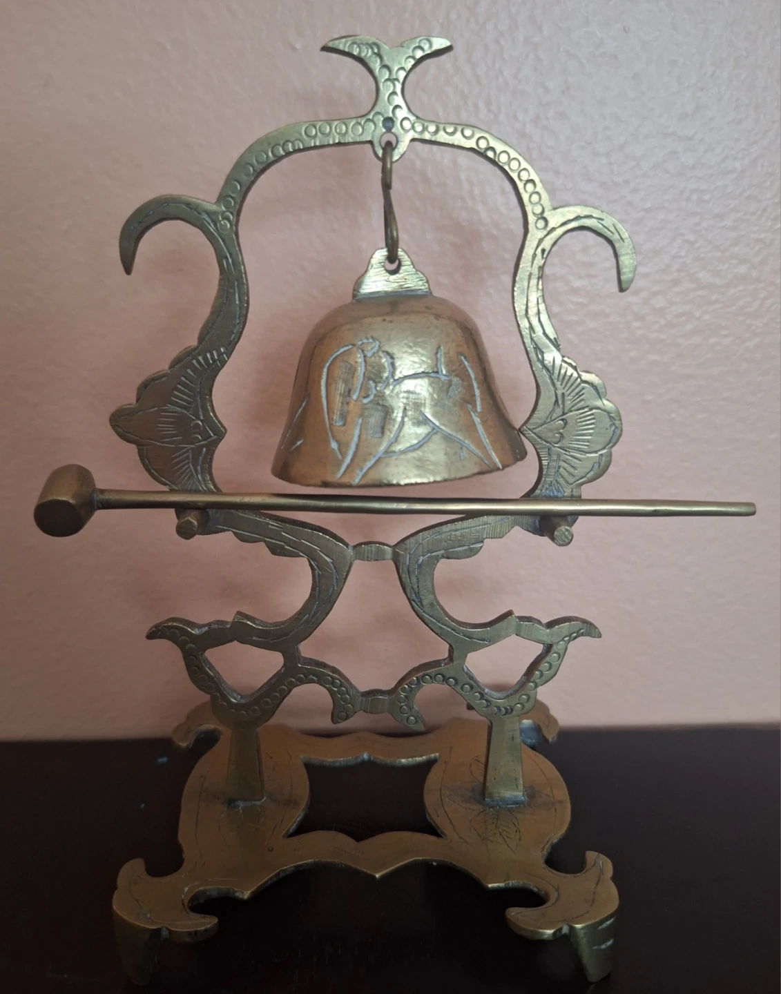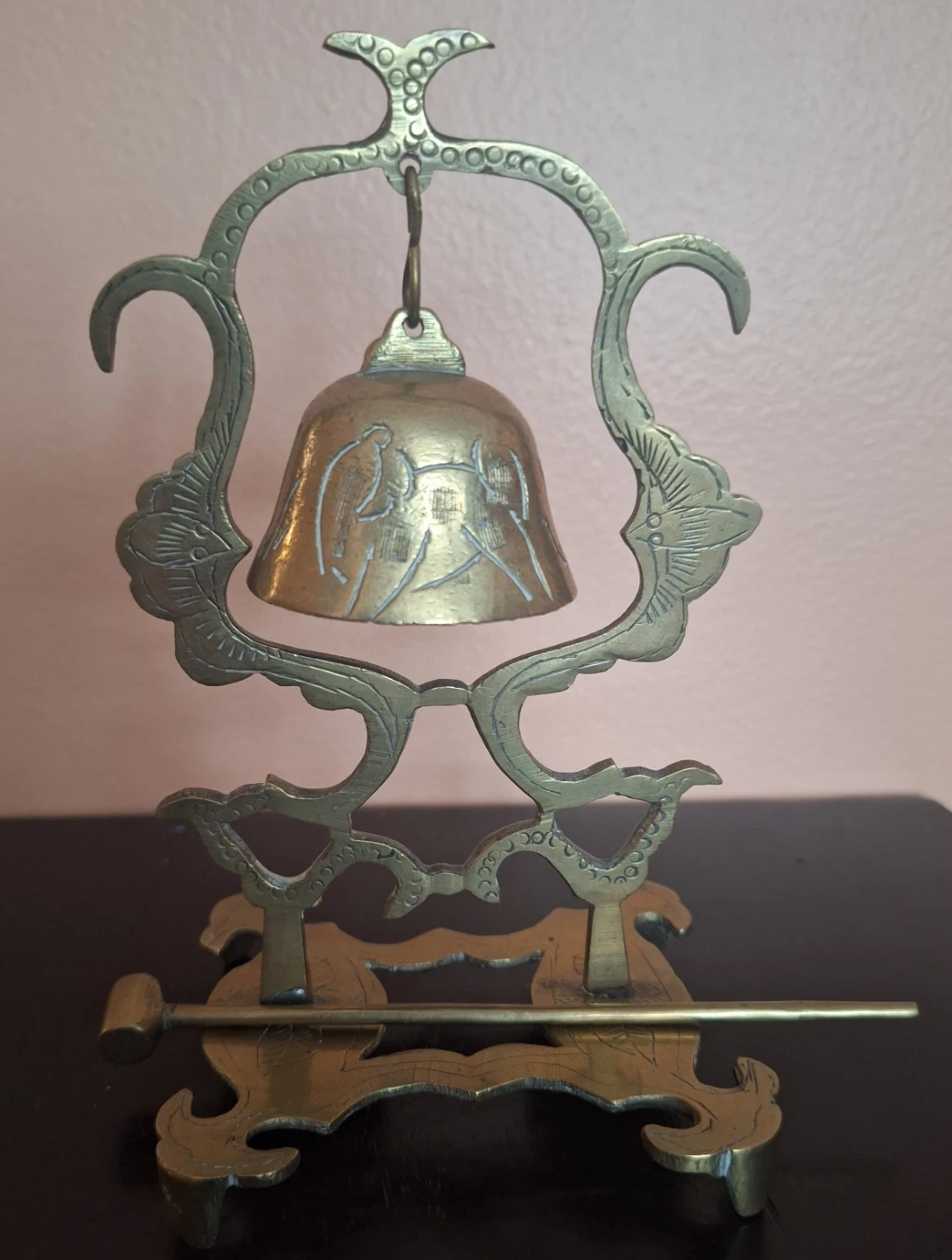 Selling a beautiful Chinese vintage brass meditation gong bell with a stand. It has an ornate design and comes with the striker. Perfect for adding a touch of zen to your space!