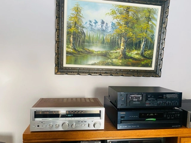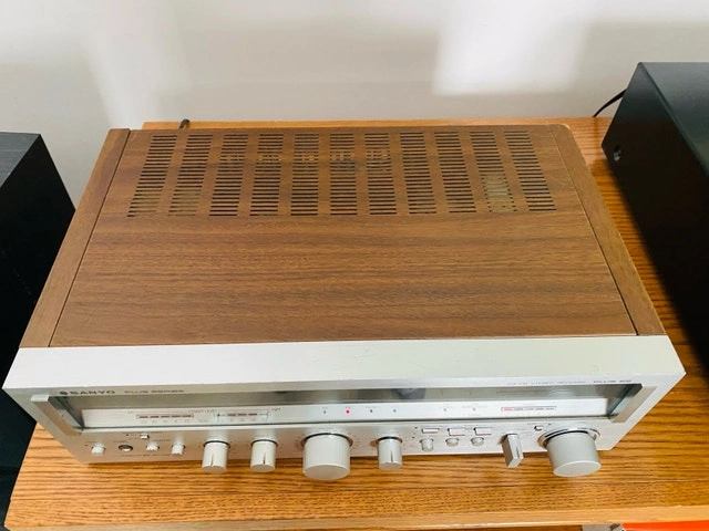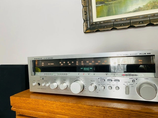This Sanyo Plus 55 Stereo Receiver offers a rich audio experience with its power and versatility. It features a built-in AM/FM tuner with manual and auto tuning, plus various audio inputs including a dedicated phono input for your turntable. You can customize the sound with the tone controls. The LED display is clear, and there's a headphone jack for private listening. A demo can be provided with tower speakers.