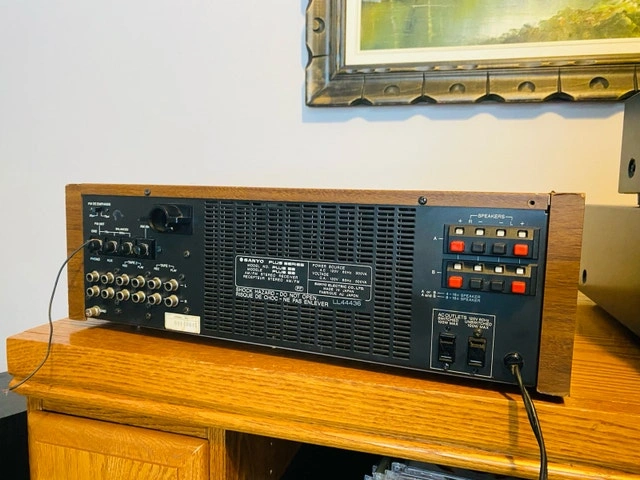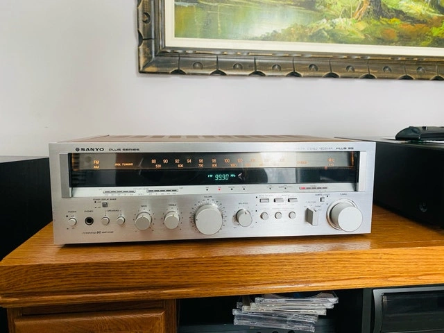 This Sanyo Plus 55 Stereo Receiver offers a rich audio experience with its power and versatility. It features a built-in AM/FM tuner with manual and auto tuning, plus various audio inputs including a dedicated phono input for your turntable. You can customize the sound with the tone controls. The LED display is clear, and there's a headphone jack for private listening. A demo can be provided with tower speakers.
