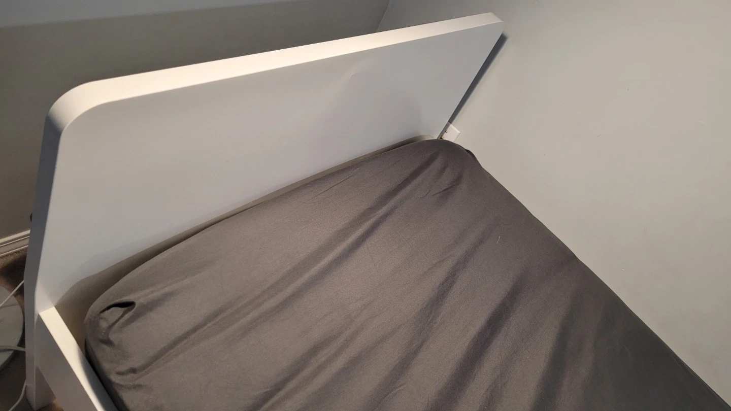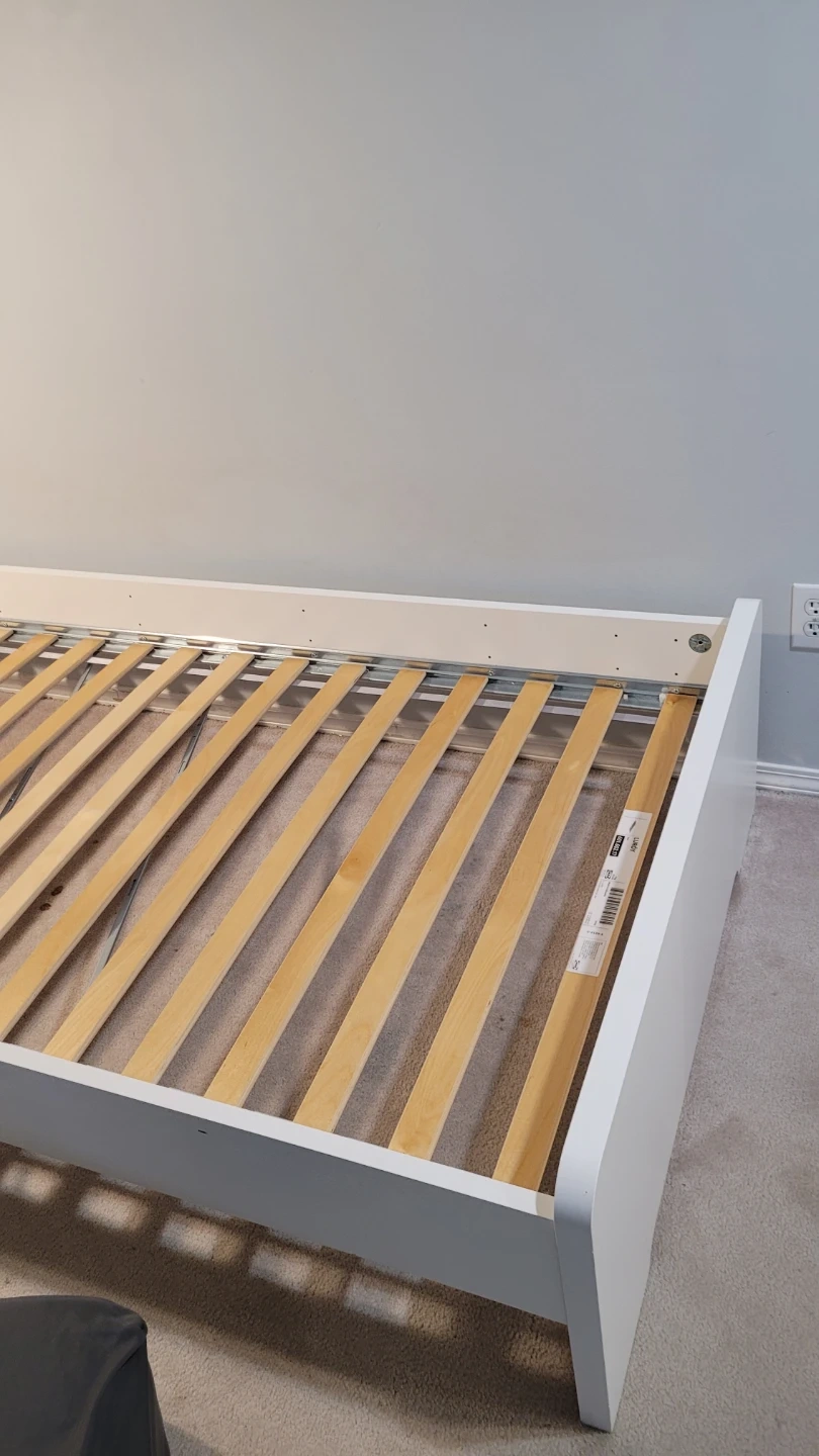 Selling an IKEA SLÄKT bed frame in white. This is a great, sturdy bed with a clean, modern look and rounded corners (great for safety!). Includes the LURÖY slatted base, so no box spring is needed—just add a mattress.