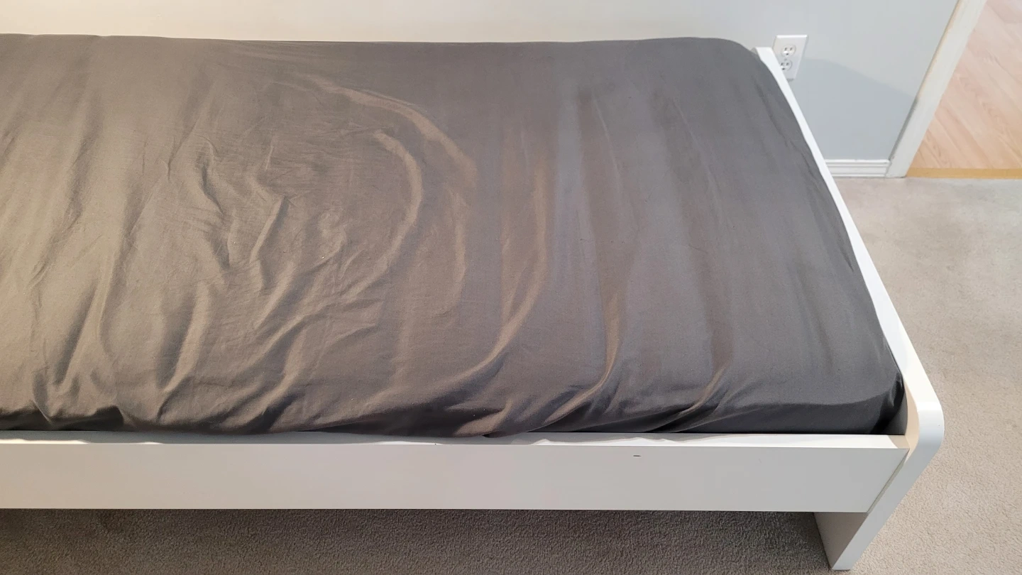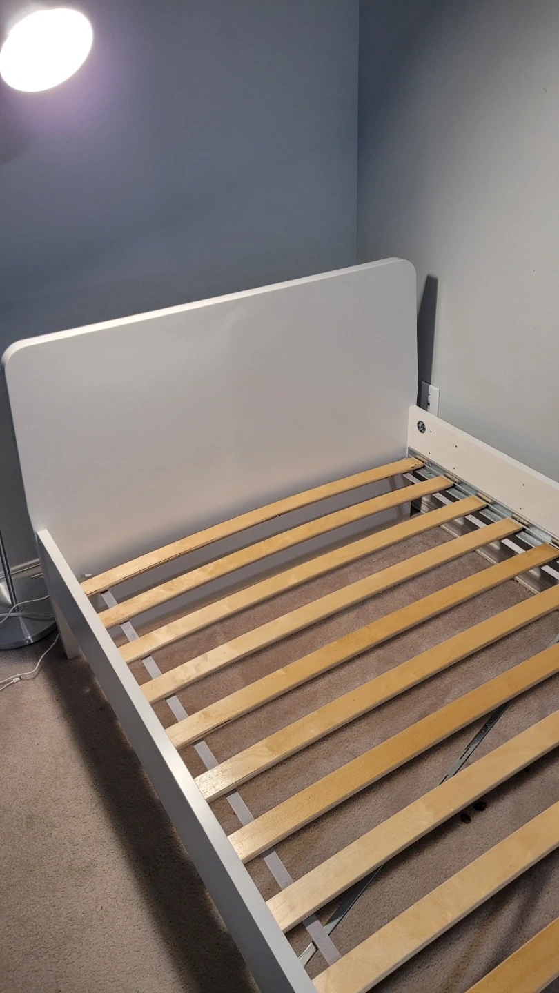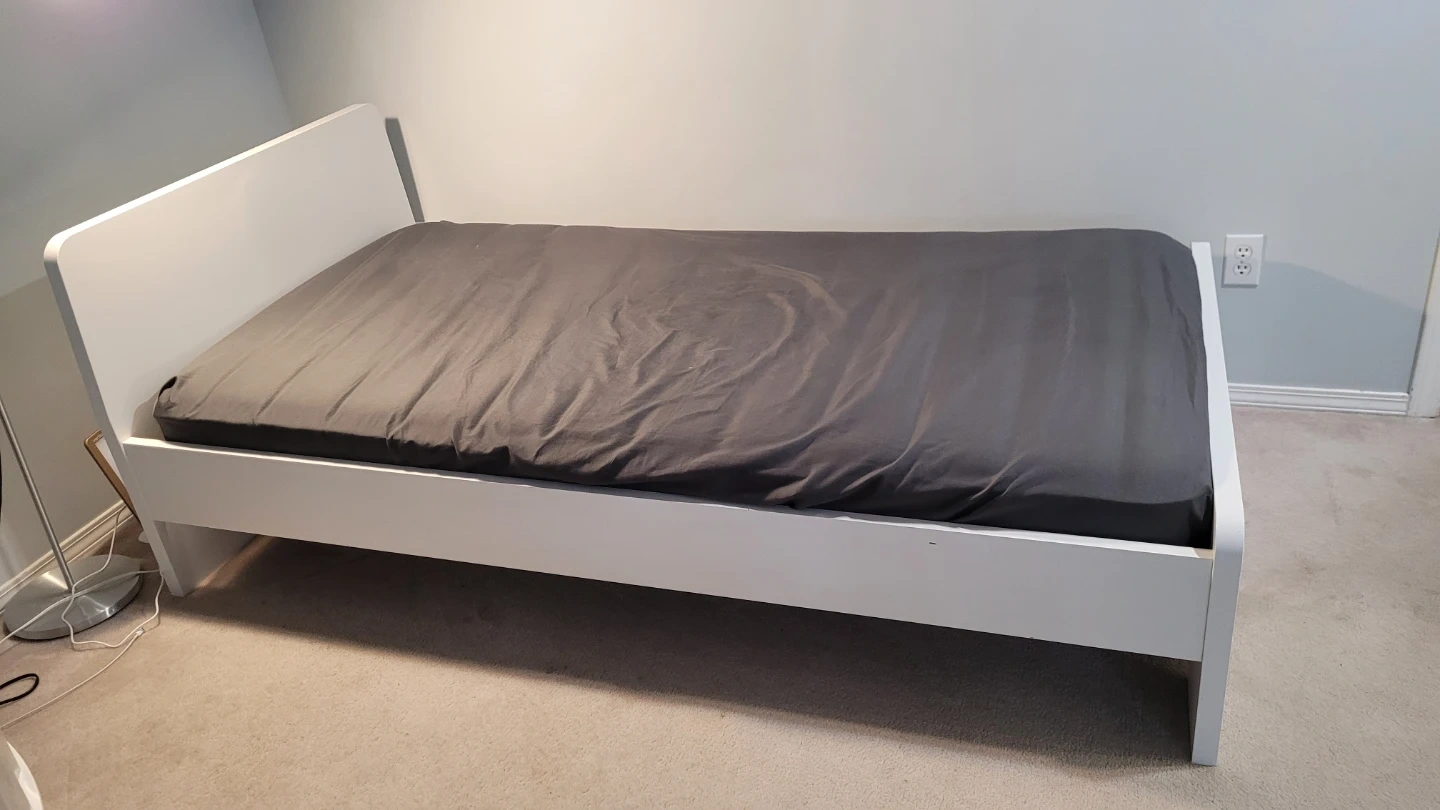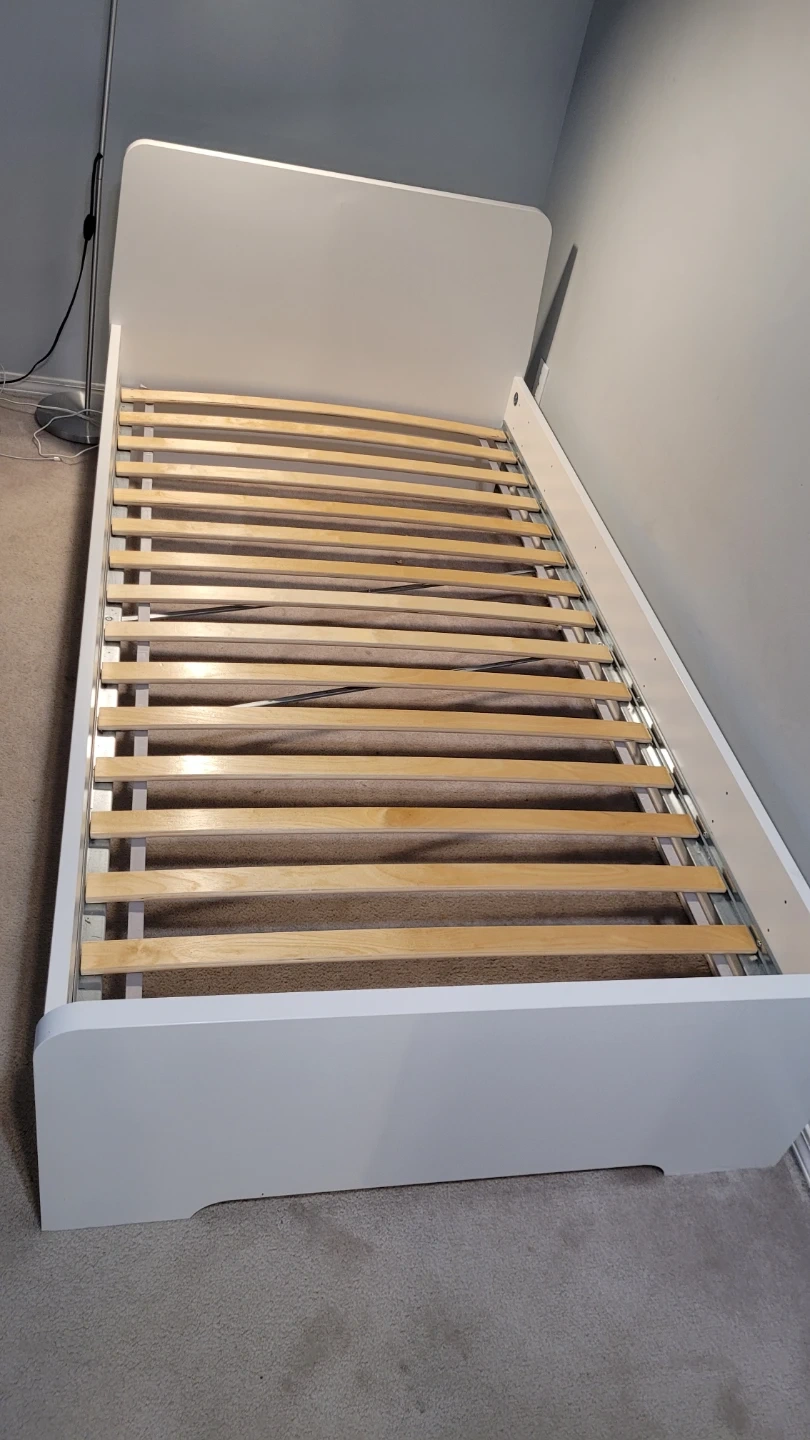 Selling an IKEA SLÄKT bed frame in white. This is a great, sturdy bed with a clean, modern look and rounded corners (great for safety!). Includes the LURÖY slatted base, so no box spring is needed—just add a mattress.