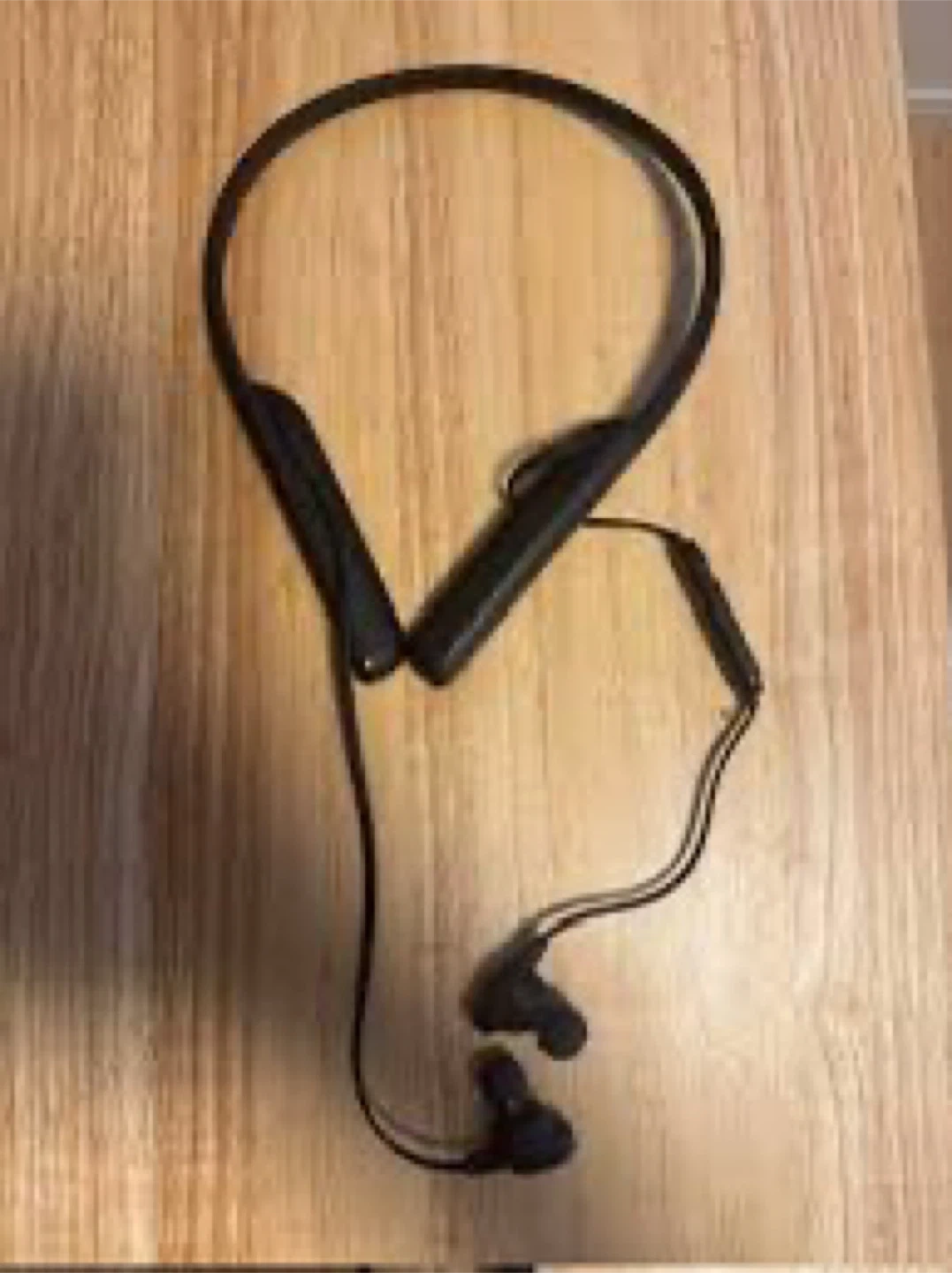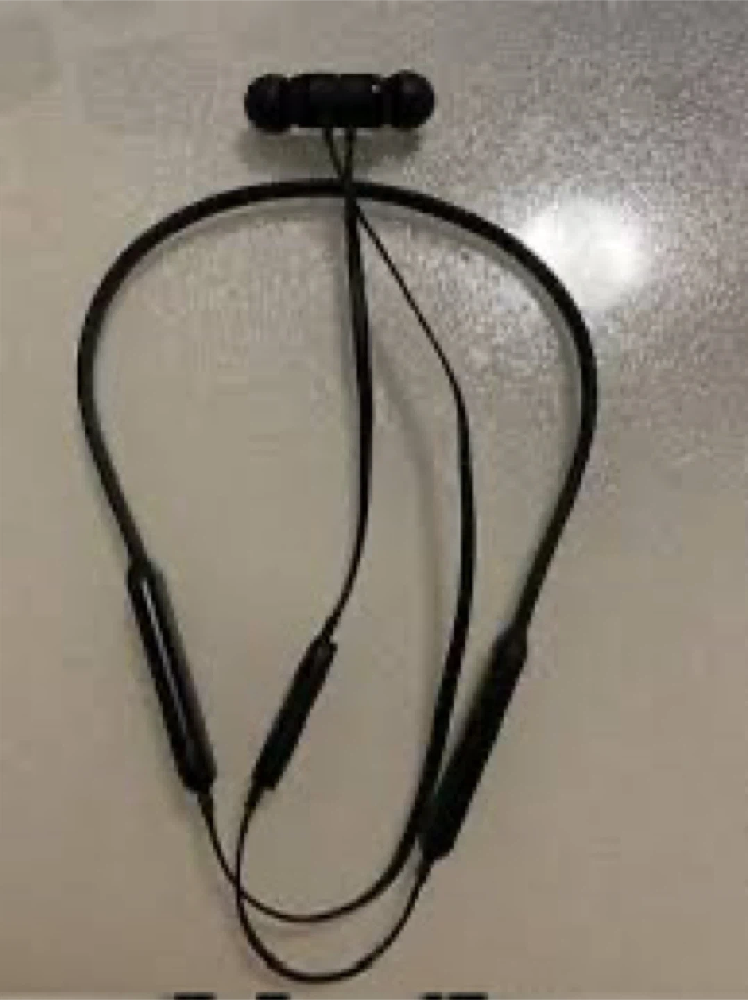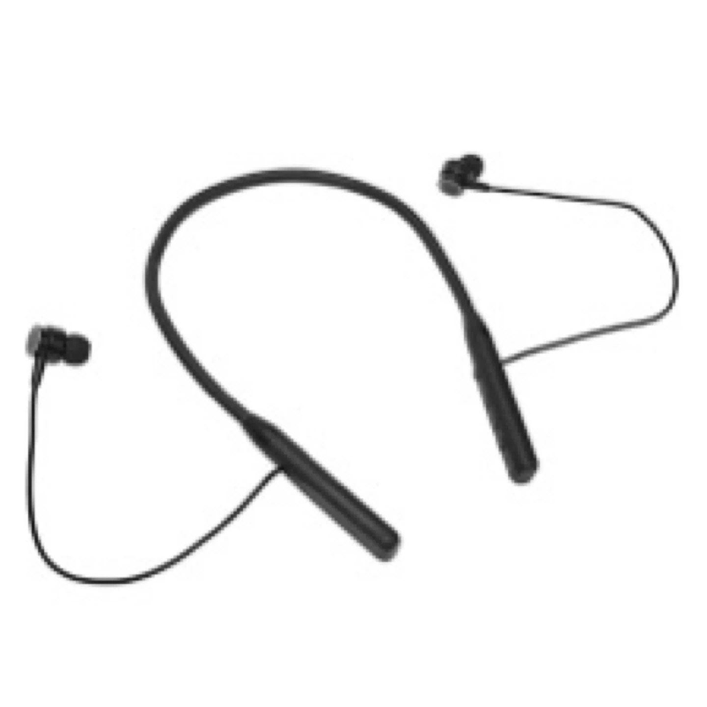 Black neckband style wireless earbuds. These earbuds are designed for a comfortable and secure fit around your neck. They offer wireless connectivity for listening to music or taking calls.