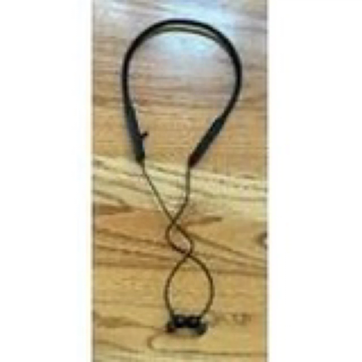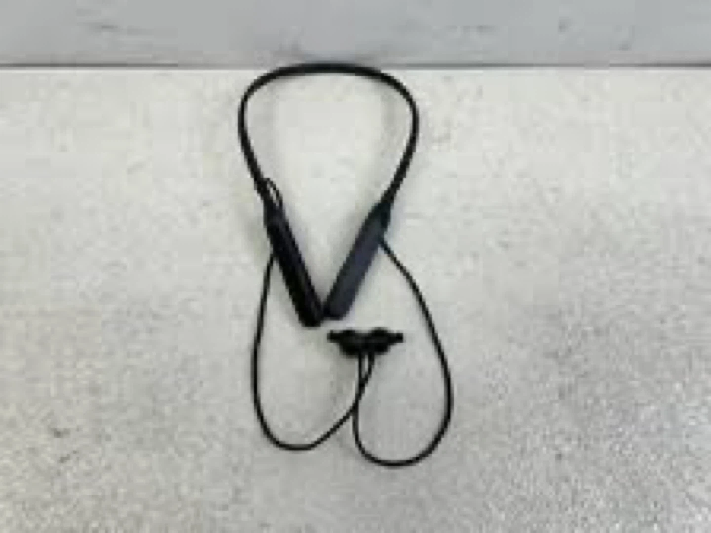 Black neckband style wireless earbuds. These earbuds are designed for a comfortable and secure fit around your neck. They offer wireless connectivity for listening to music or taking calls.