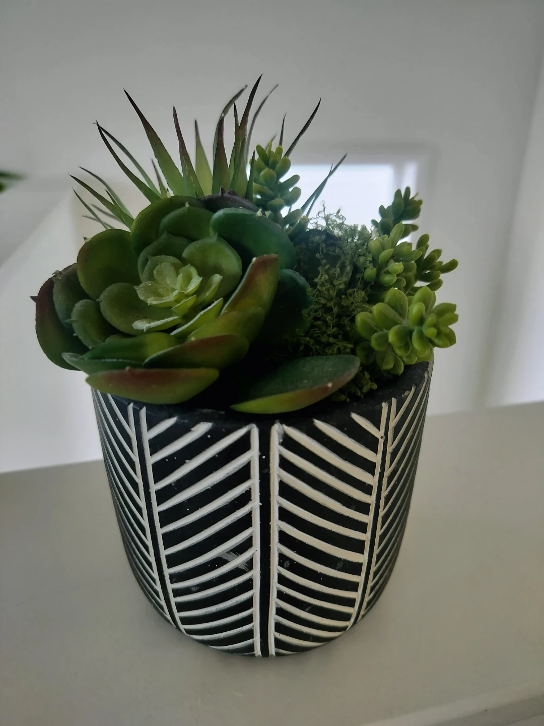 This arrangement features a variety of artificial succulents and moss in a decorative black and white patterned pot. It's a maintenance-free way to add a touch of greenery to any space. The pot has a modern, geometric design.
