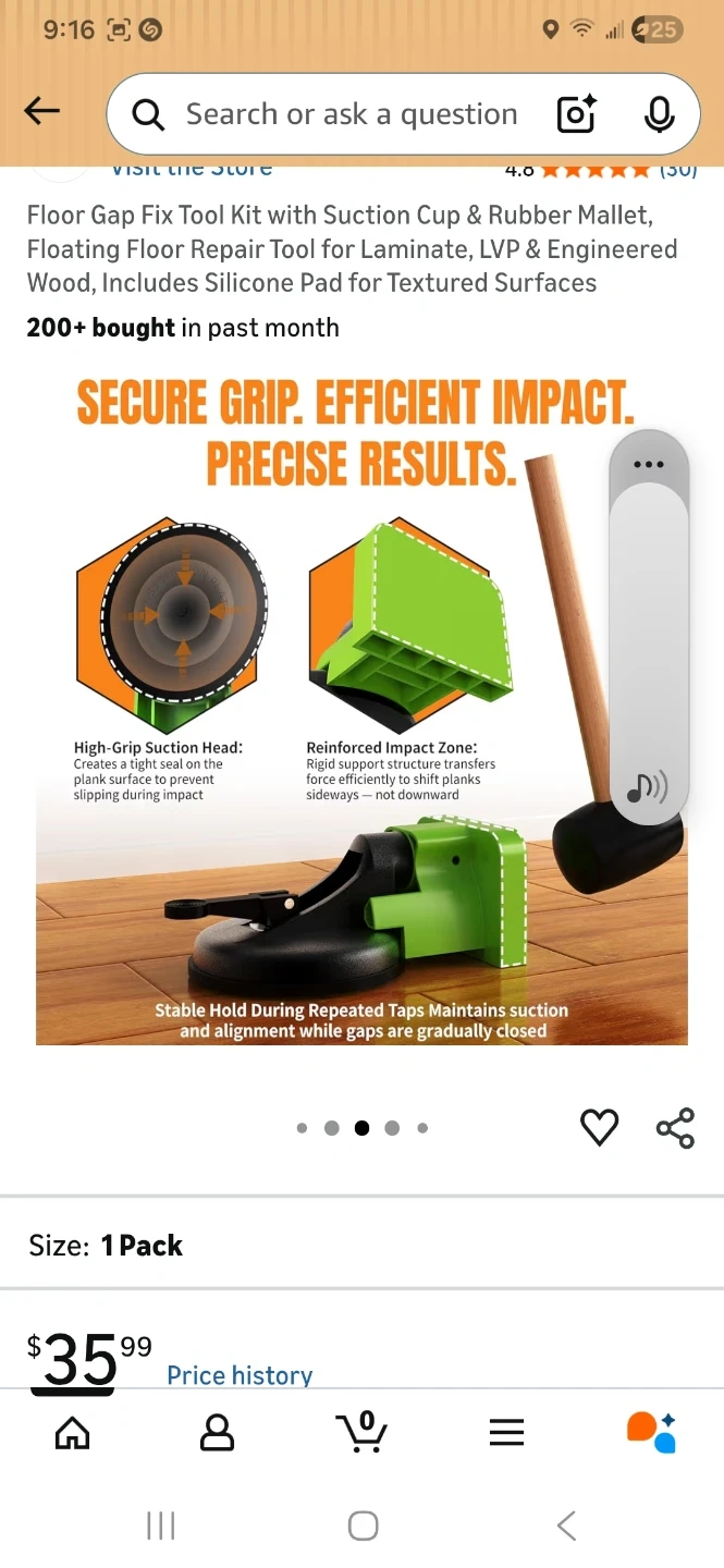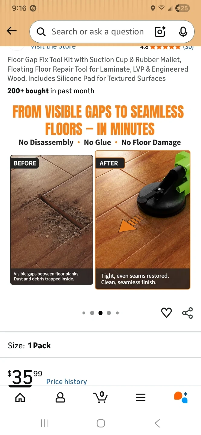 This floor gap fix tool kit includes a suction cup and rubber mallet. It also comes with a silicone pad for textured surfaces. Helps close gaps between floor planks.