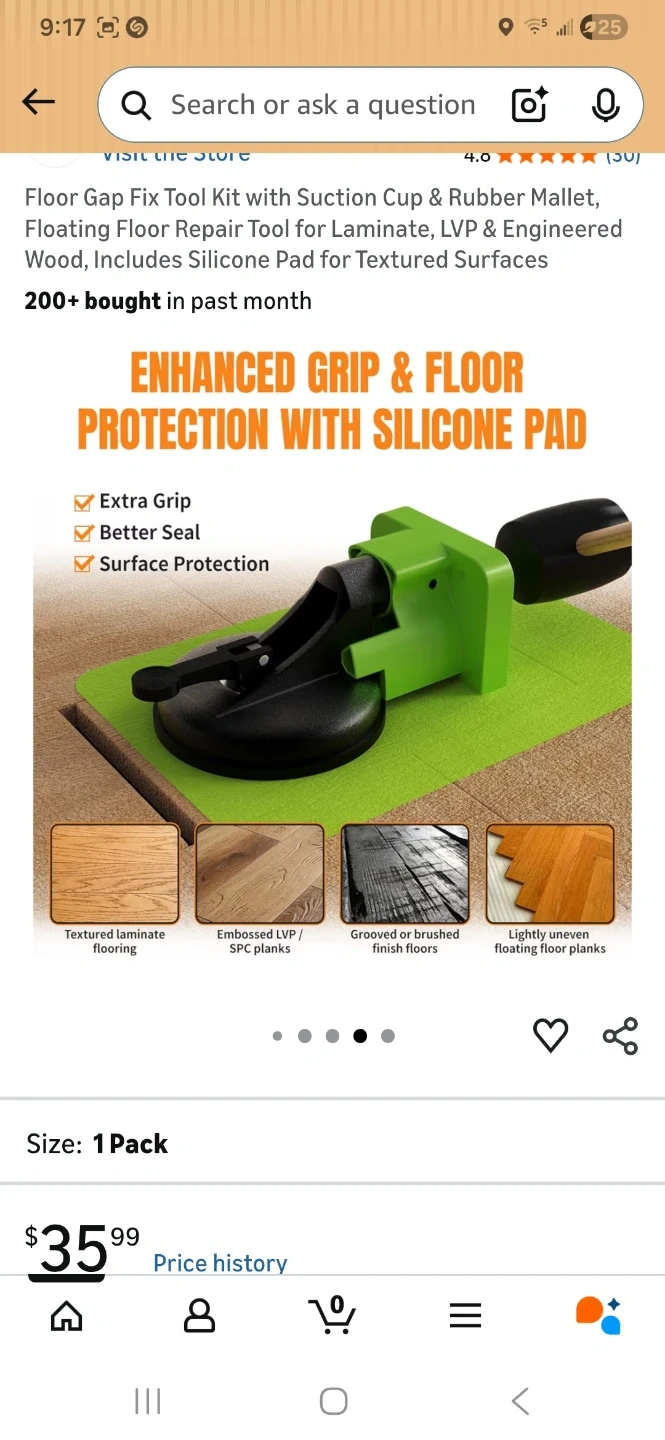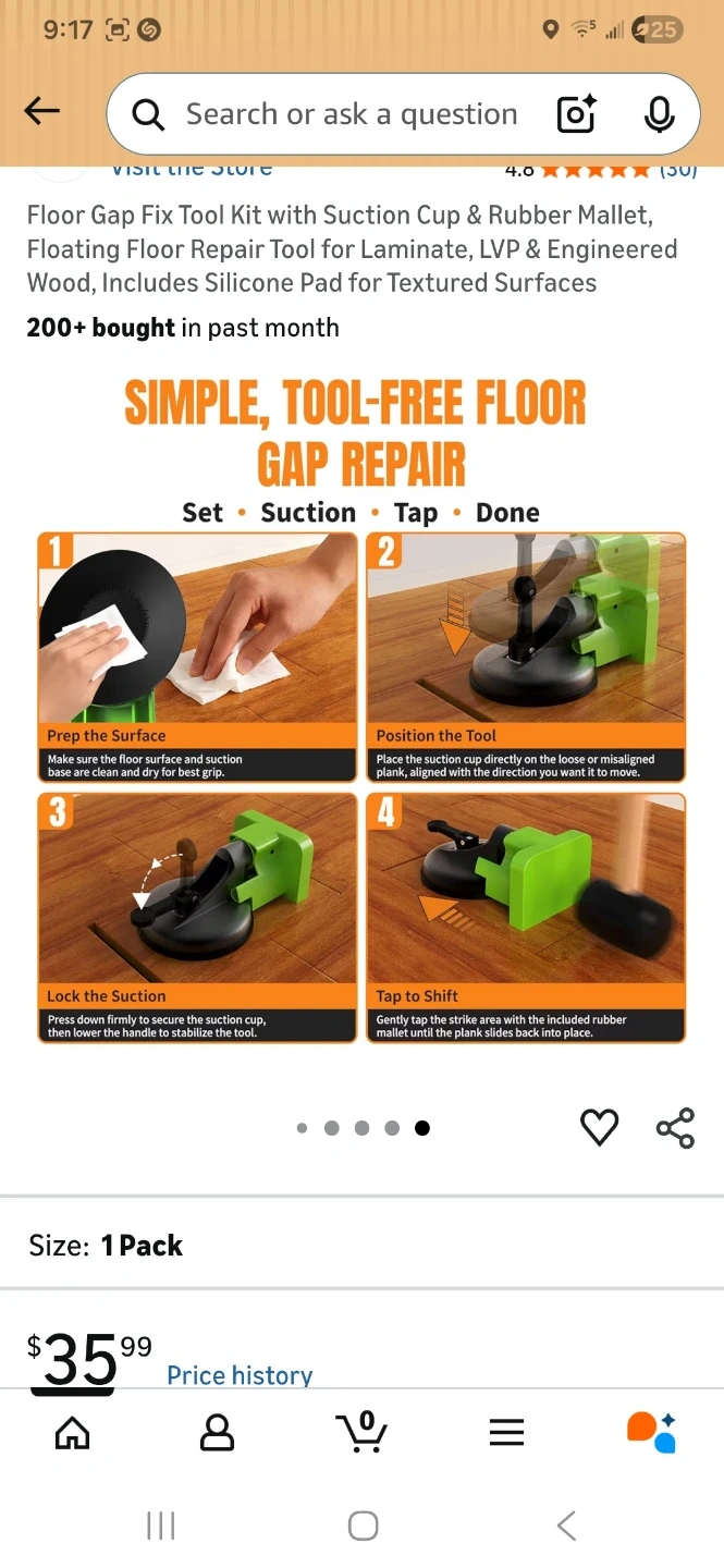 This floor gap fix tool kit includes a suction cup and rubber mallet. It also comes with a silicone pad for textured surfaces. Helps close gaps between floor planks.