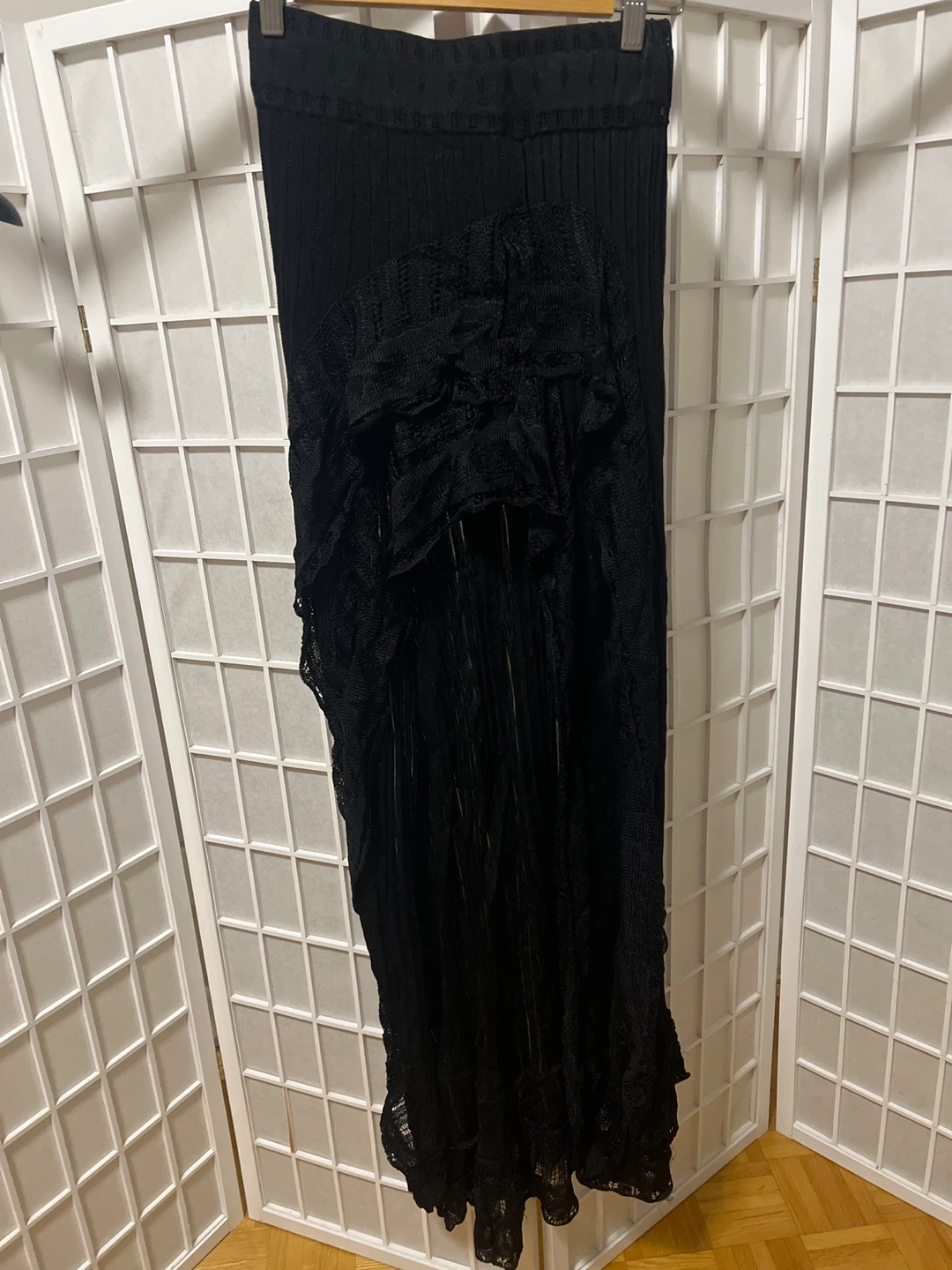 A flowing black maxi skirt featuring ruffled lace detailing. It's designed with a ribbed waistband and a tiered, asymmetrical hem. This skirt offers a unique gothic or bohemian aesthetic.
