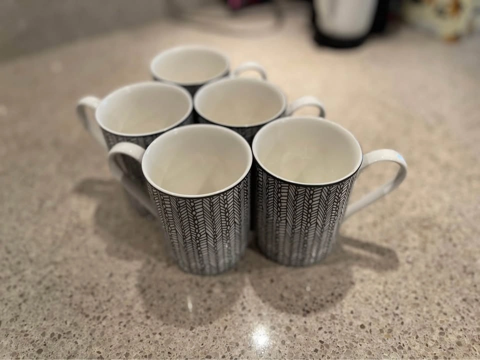 Like-new set of 5 mugs/cups with a clean black-and-white pattern. Great for coffee, tea, or guests. No chips or cracks. Pickup: Downtown Vancouver (Smithe & Hornby). Cash only.