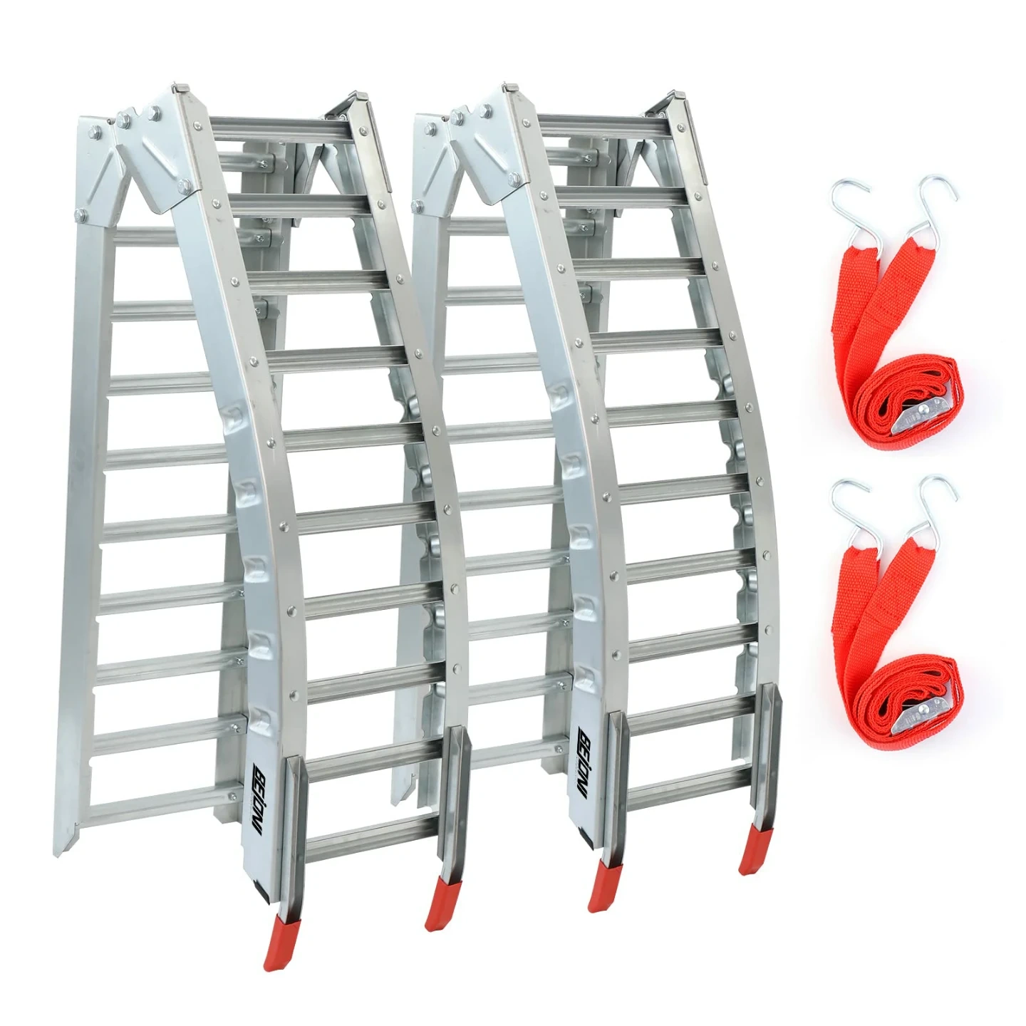 Comes as a pair of sturdy aluminum loading ramps. They're foldable for easy storage. Includes two red securing straps to help keep them in place. Great for loading ATVs or other equipment into a truck bed!