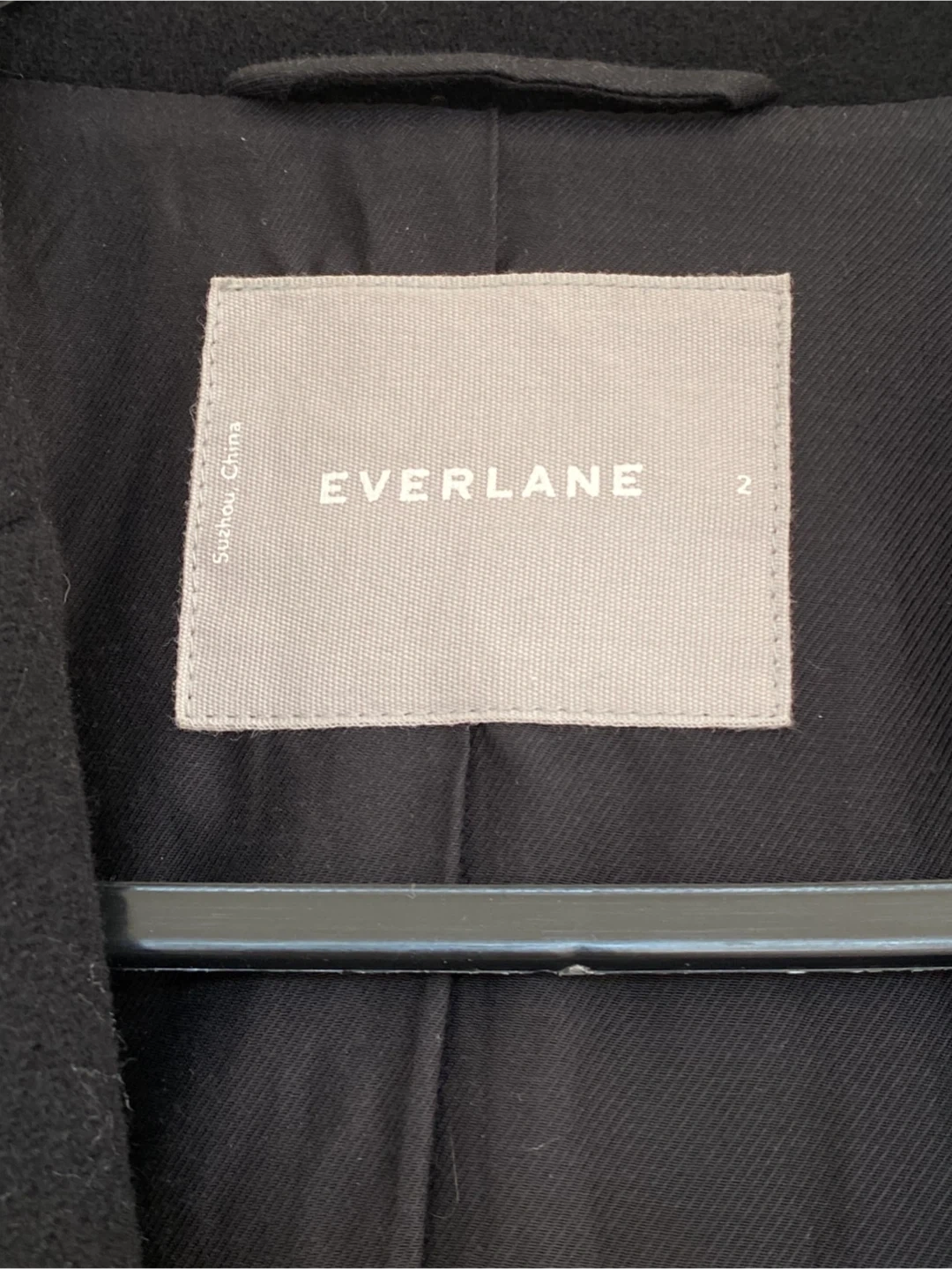 This is an mint condition Everlane black coat. It's a size 2. The coat has a classic button-up front and a notched lapel. It's perfect for cooler weather!