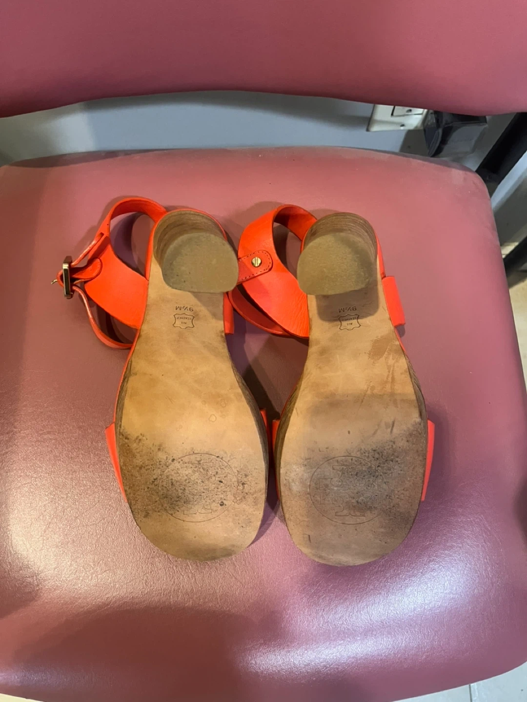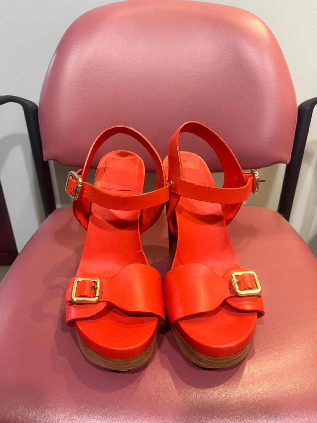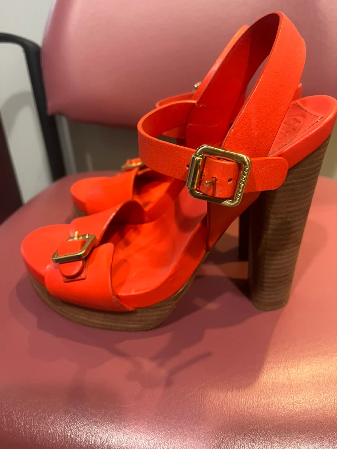 These Tory Burch heeled sandals are crafted from bright orange leather. They feature a chunky wooden block heel and platform sole with adjustable ankle straps. The size is 9.5